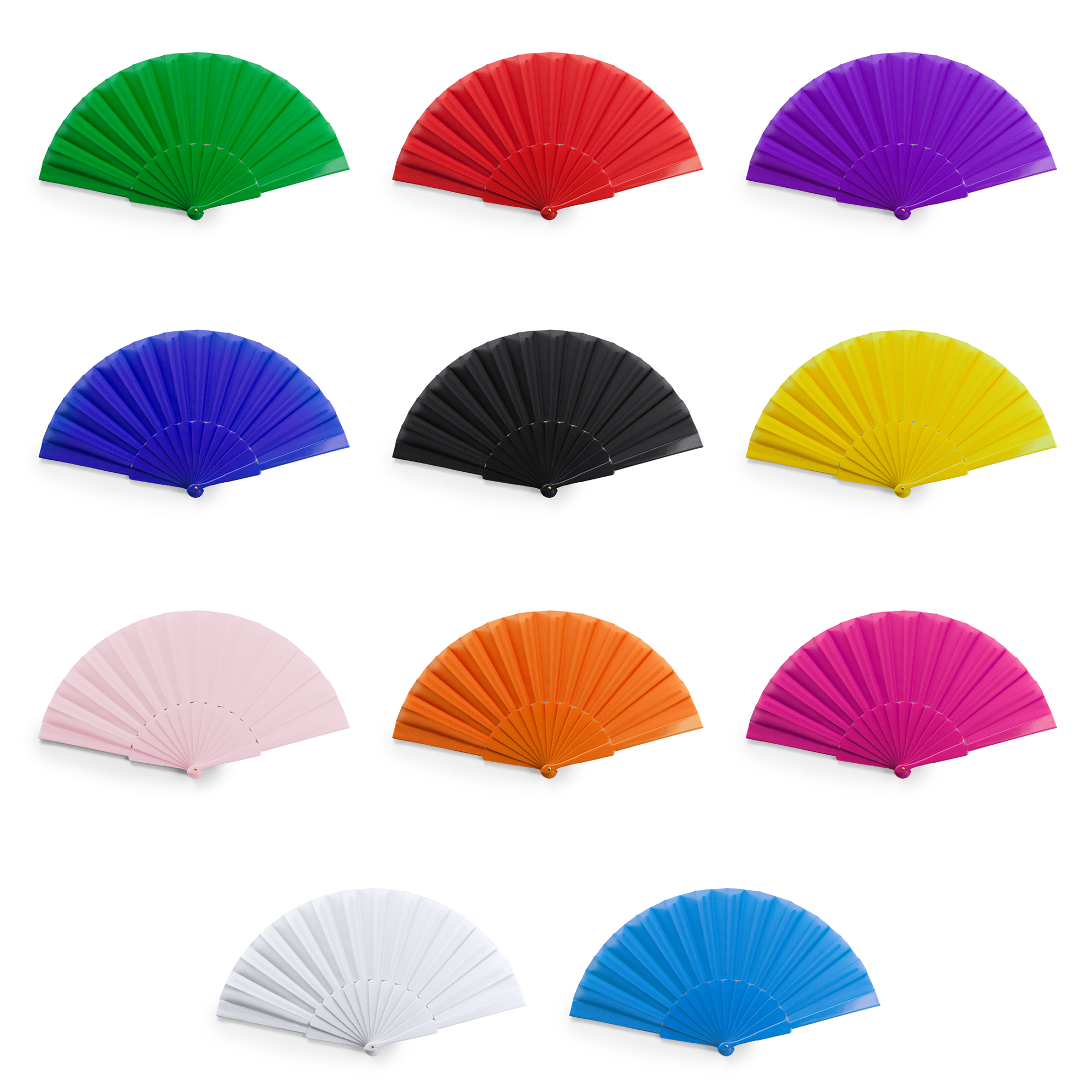 Abanico con varillas de plástico y tela en poliéster.