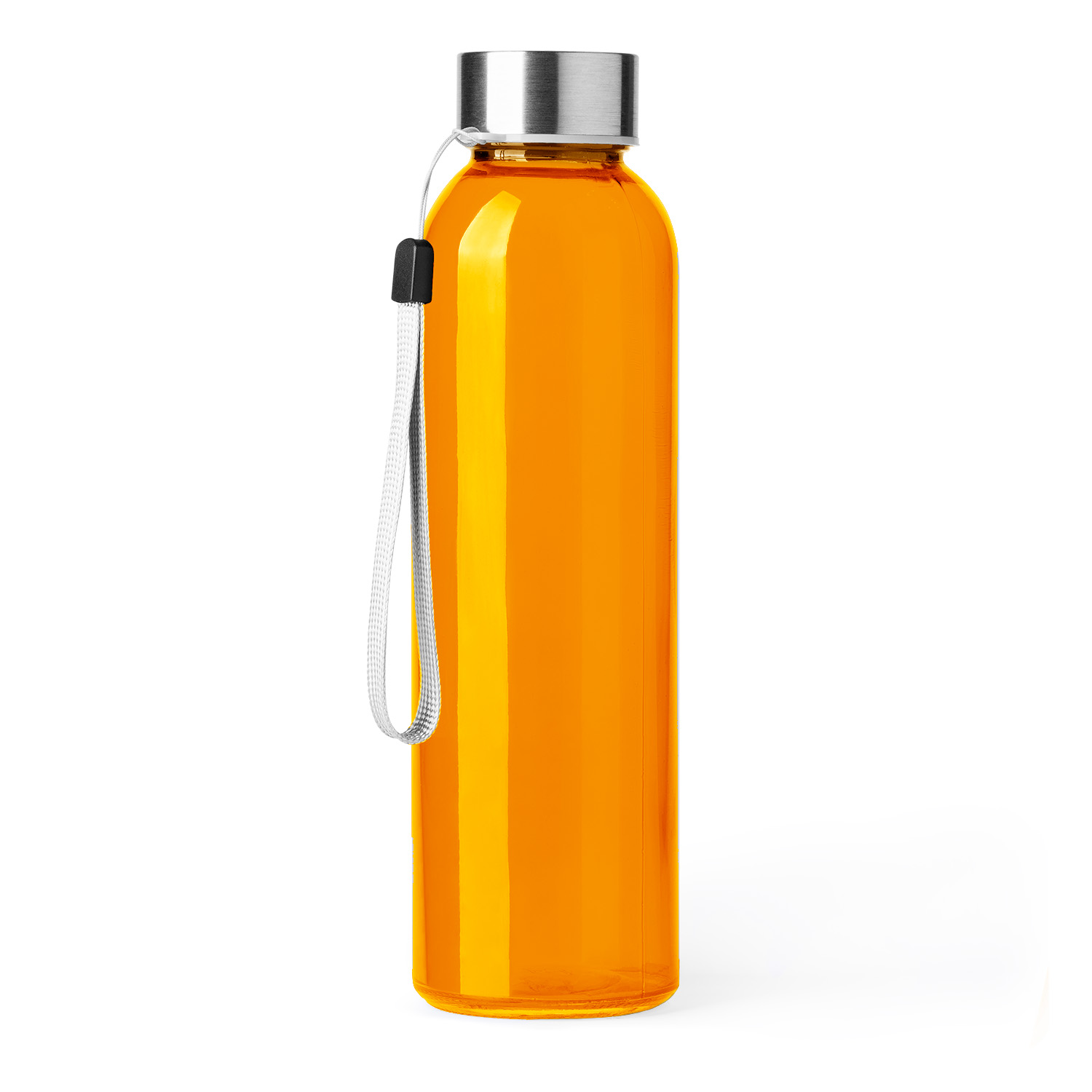 Bidón de cristal con capacidad de 500ml disponible. Gran variedad de colores, con tapa enroscable de acero inoxidable y de fácil transporte, gracias a su cinta, en color gris.
