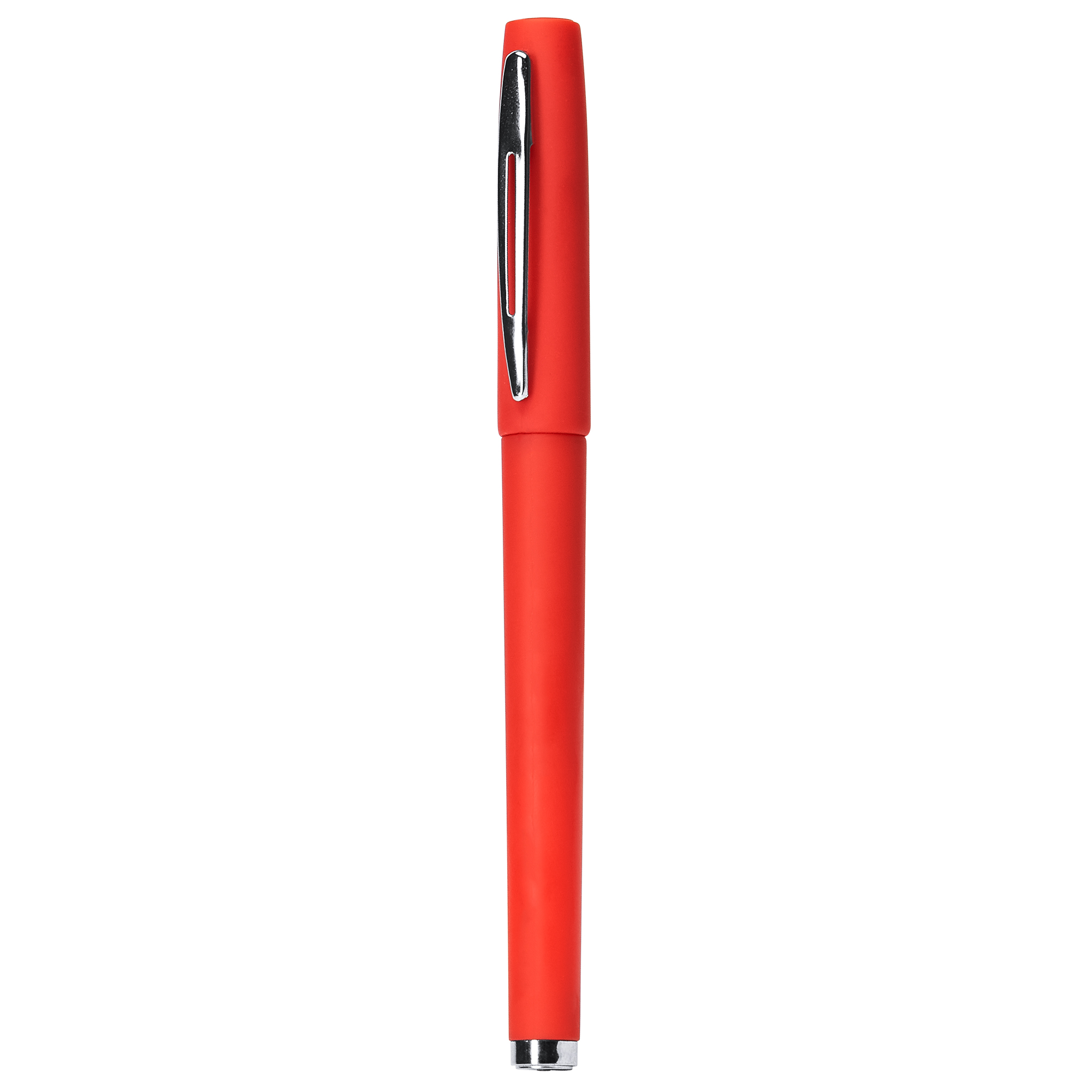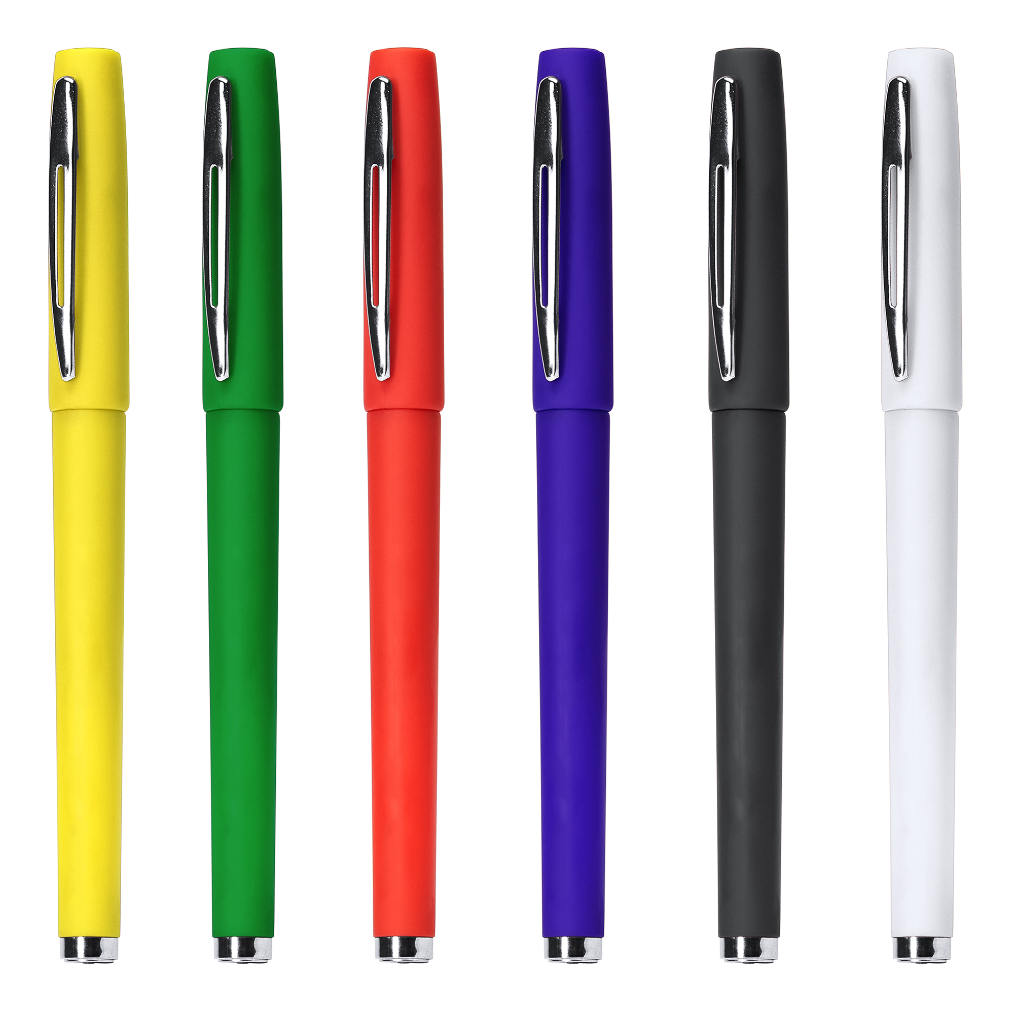 Bolígrafo tipo roller con clip metálico y punta de acero. Cuerpo de vivos colores con tacto suave en acabado en textura suave. Carga jumbo de 0,7mm con tinta azul.