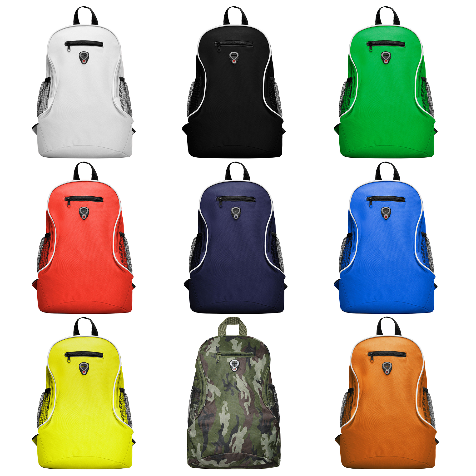 Cómoda mochila con asas ajustables elaborada en poliéster 600D, con asa superior para colgar, bolsillo frontal con cremallera para pequeño almacenamiento, bolsillos laterales en tejido micro perforado y salida para auriculares.