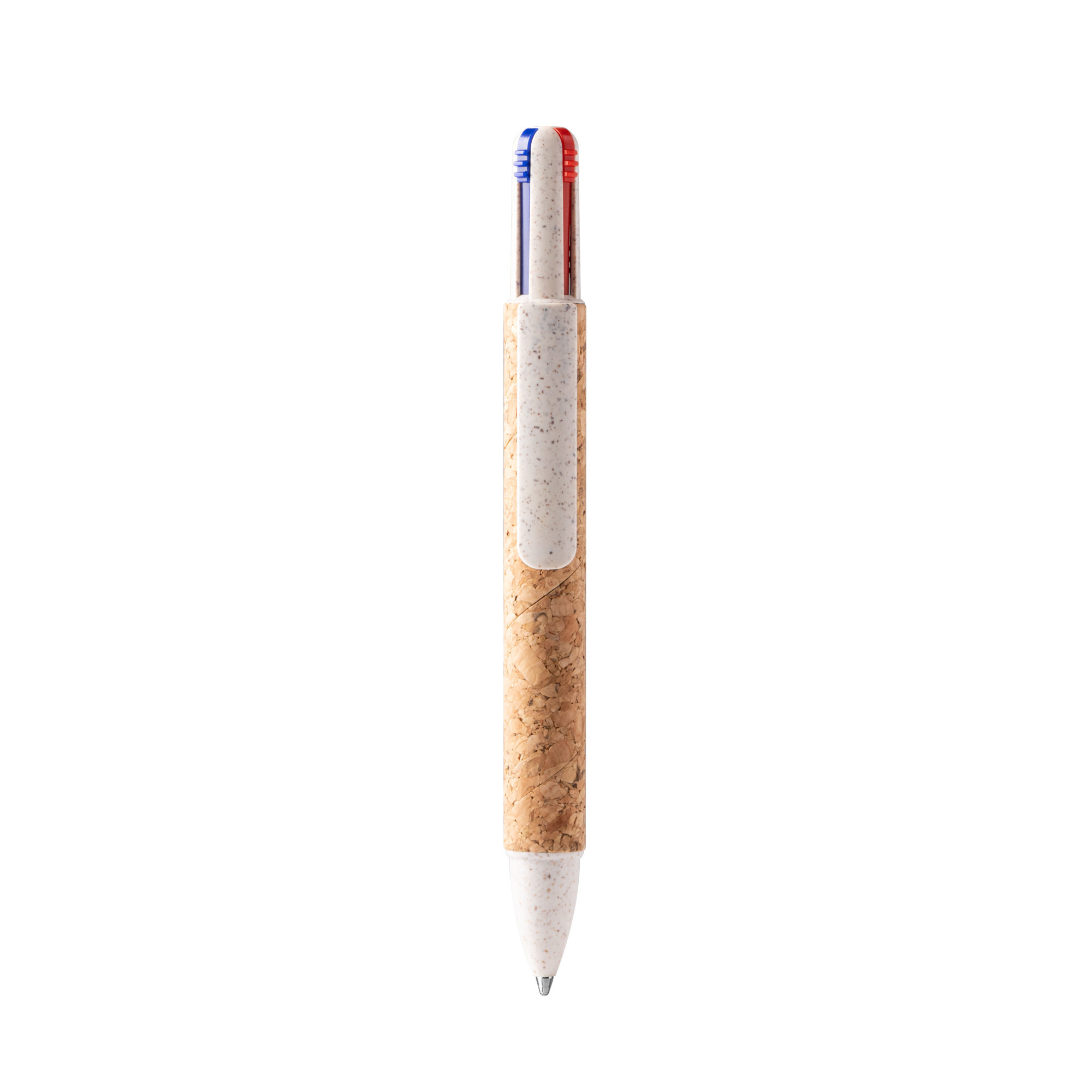 Bolígrafo de 4 tintas con pulsador retráctil. Cuerpo de corcho y fibra de trigo. Tinta azul, rojo, verde y negro.