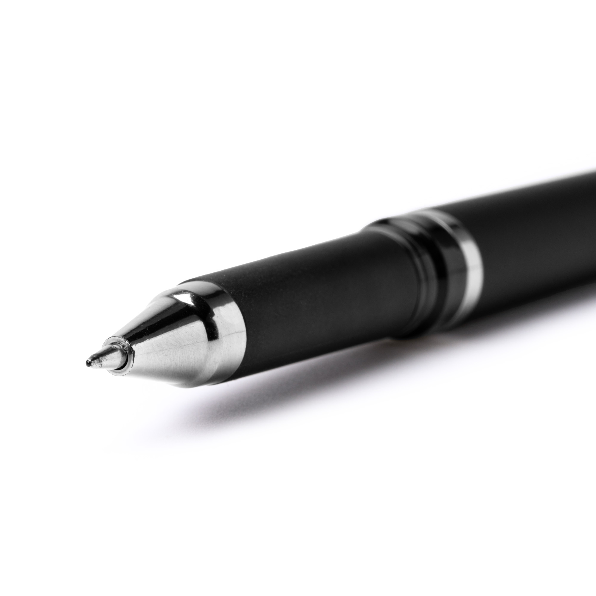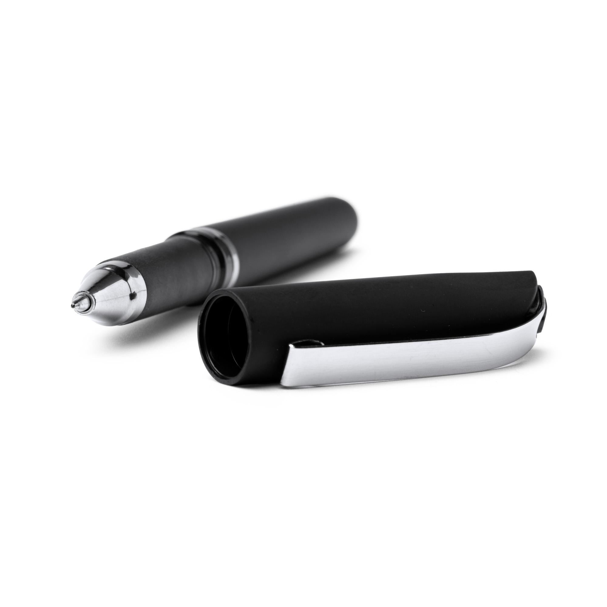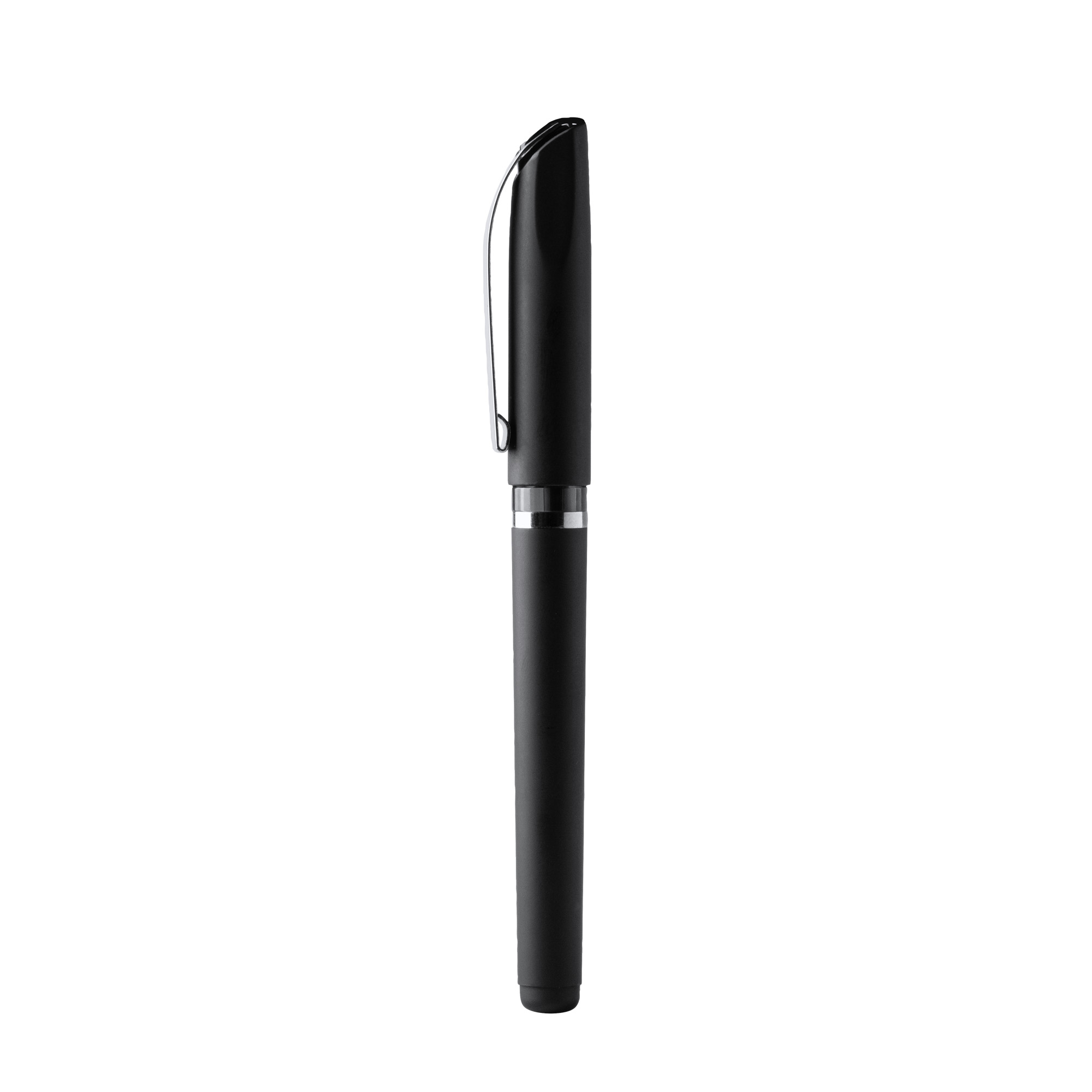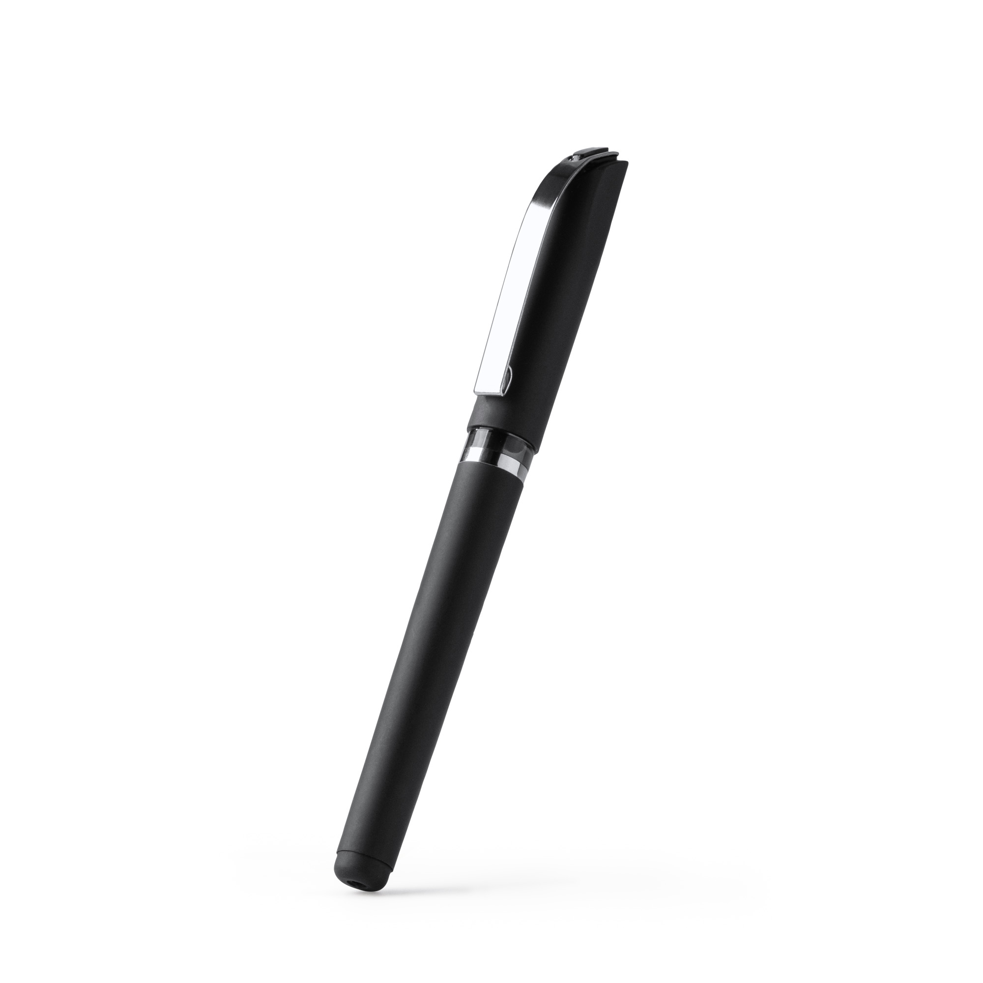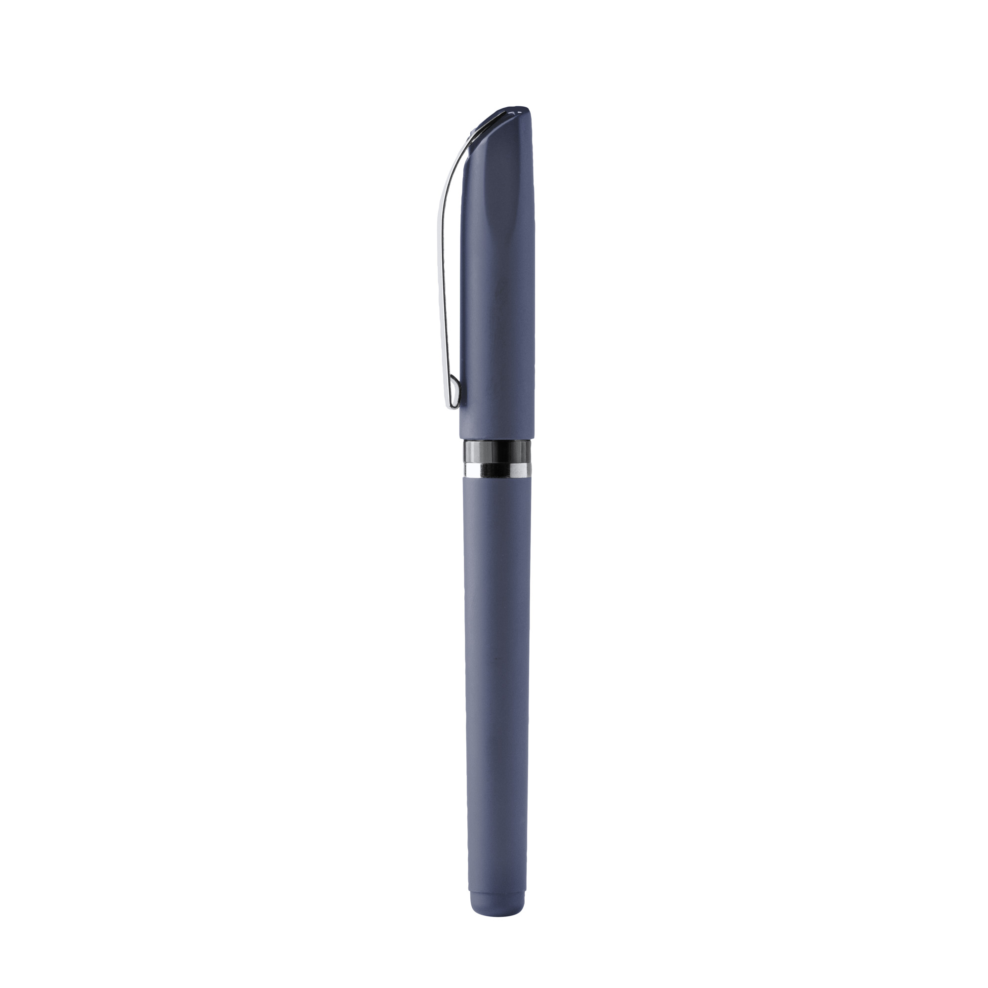 Bolígrafo roller elaborado en resistente ABS con tacto goma en acabado mate. Cuenta con tapa con clip y detalles metalizado. Carga jumbo de tinta gel azul.