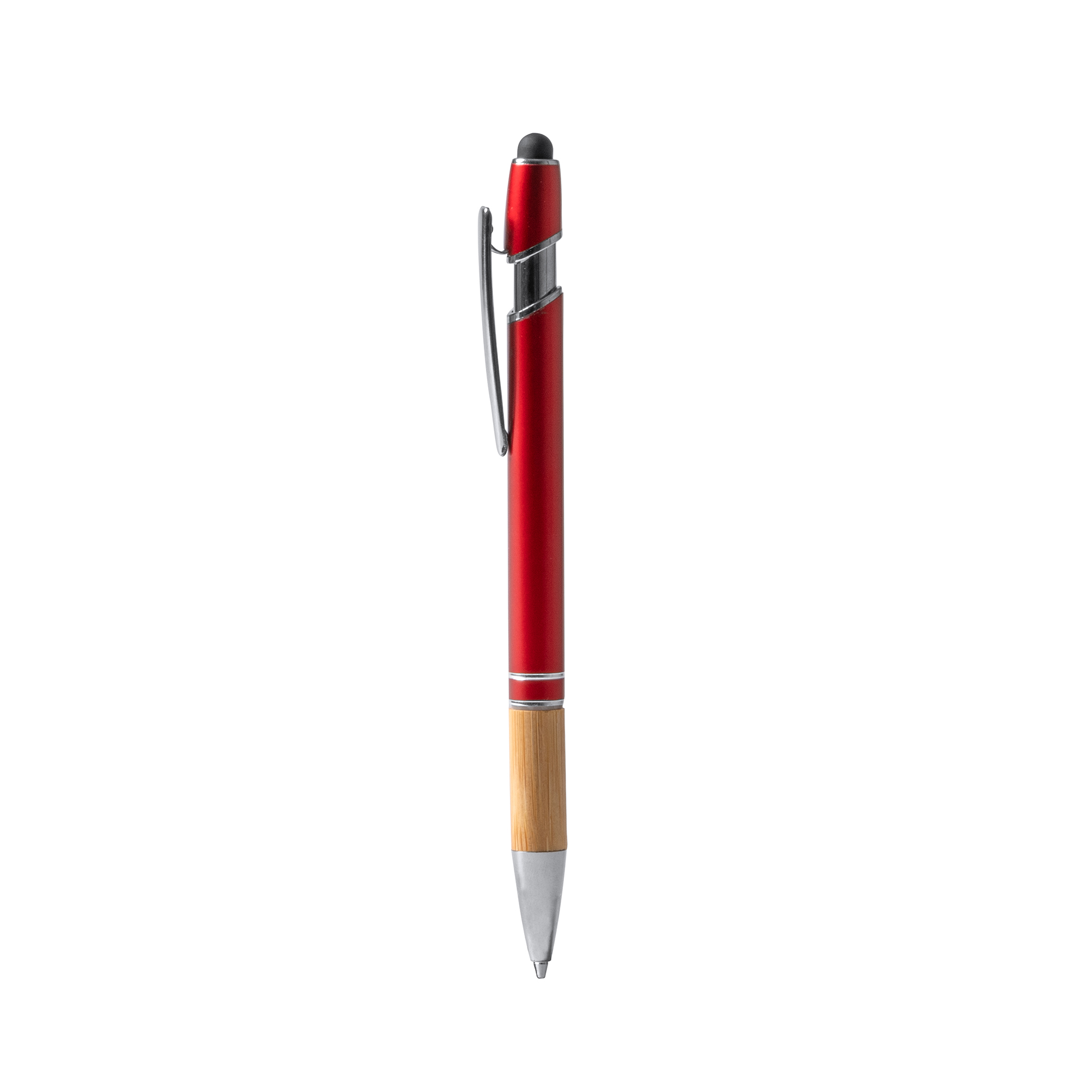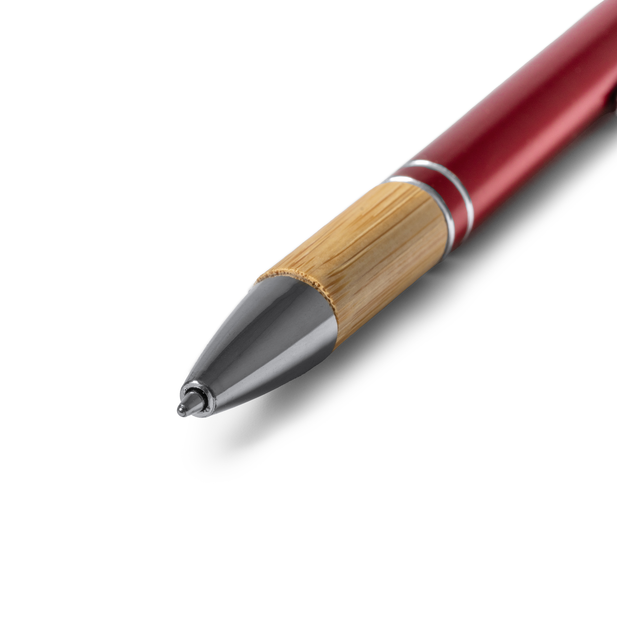 El bolígrafo de metal con empuñadura de bambú y detalles cromados.
