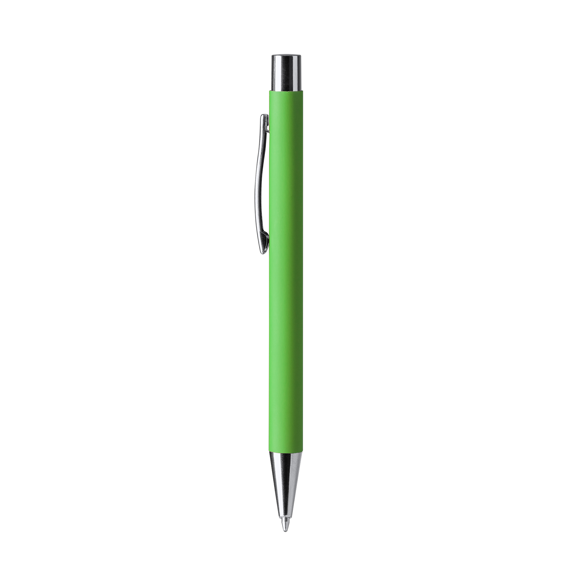 Bolígrafo con pulsador y cuerpo metálico de tacto suave. Punta, clip y pulsador en metal cromado. Cuenta con carga jumbo de tinta azul. Especial para marcaje láser.