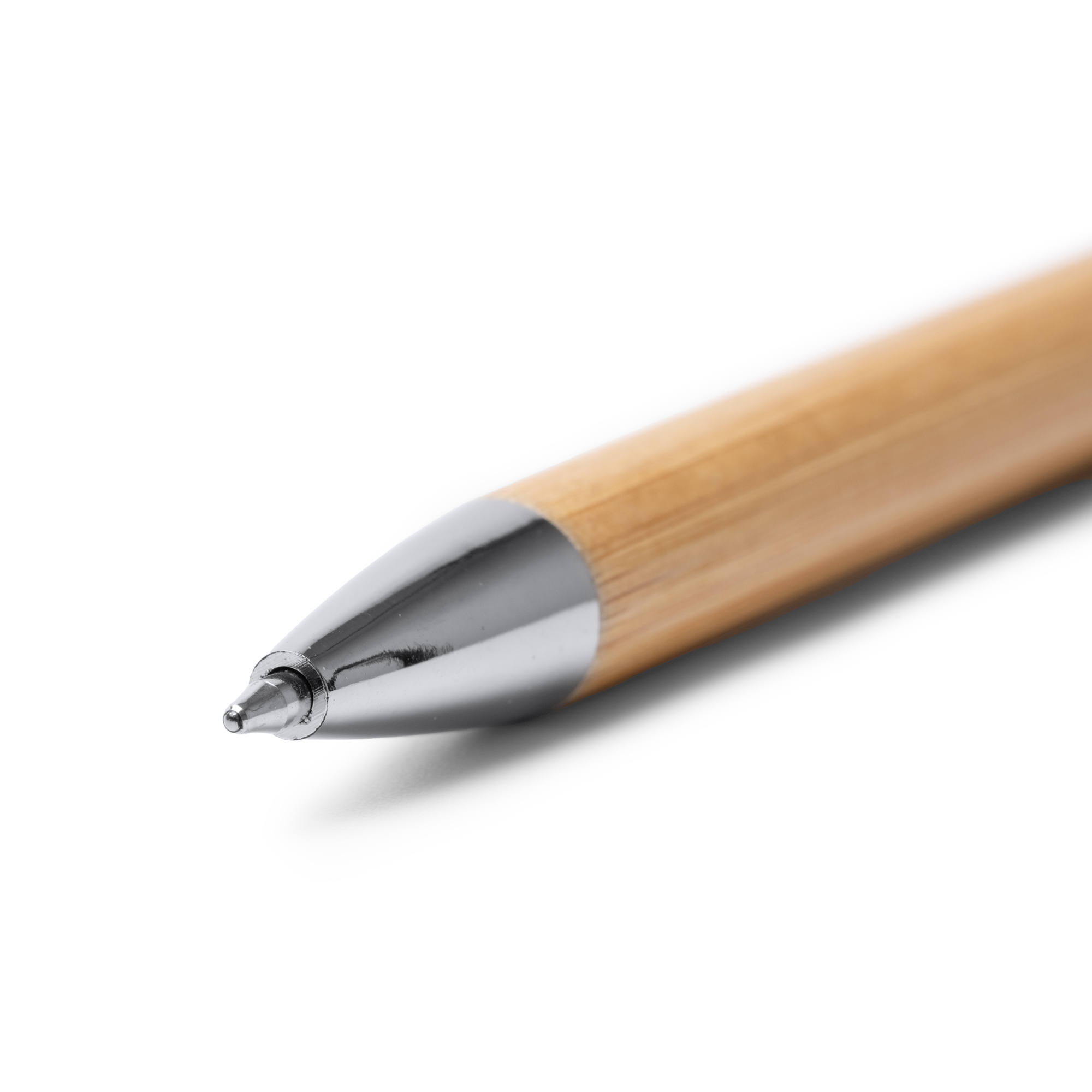 Bolígrafo con cuerpo y pulsador de bambú, clip metálico y detalles cromados. Tinta azul.