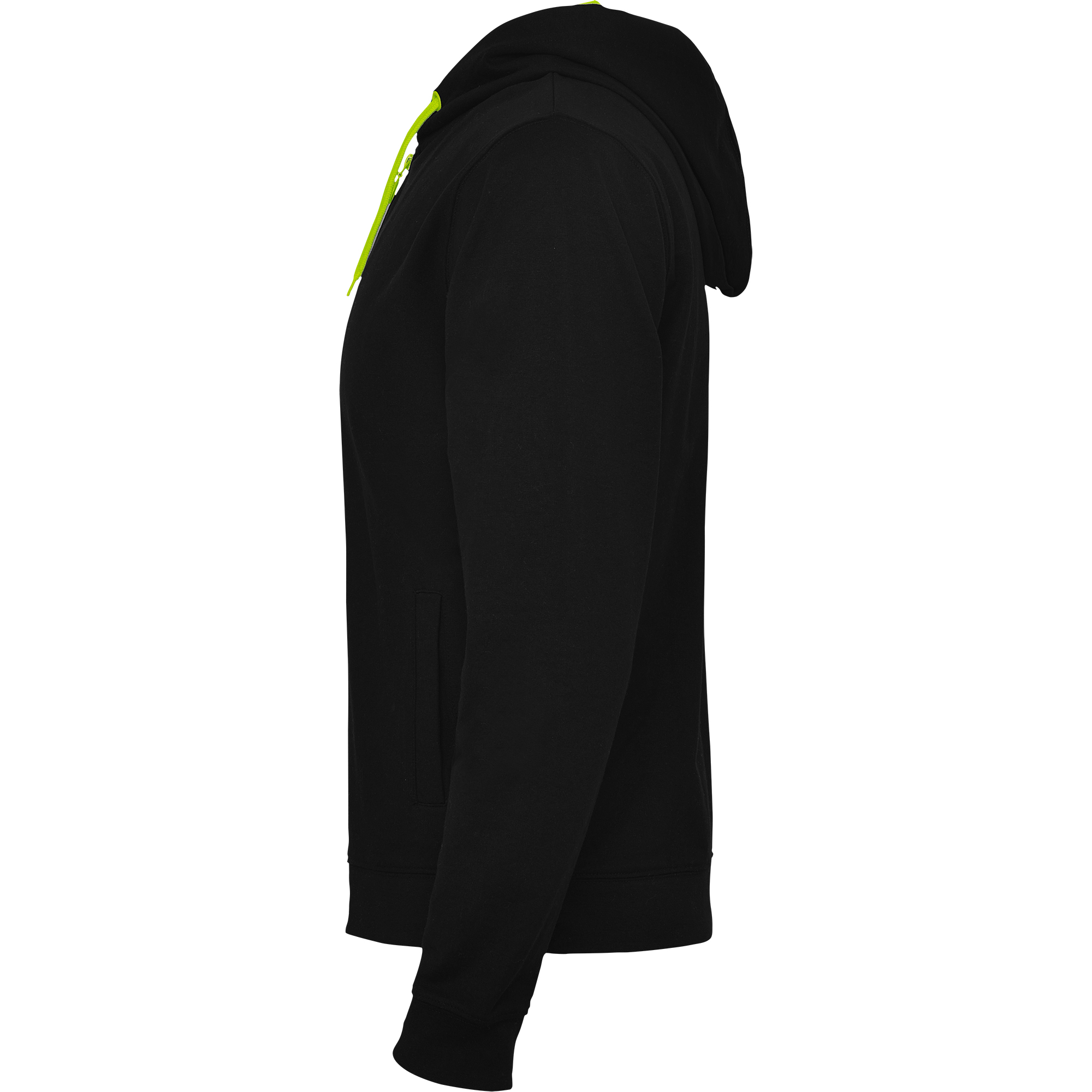 Sudadera con cremallera frontal y capucha no perchada. Capucha forrada con rejilla de poliéster. Cordones planos de poliéster. Puños y cinturilla en canalé 2×1 con elastano. Cubrecosturas del mismo tejido. Opciones de colores lisos y a contraste.