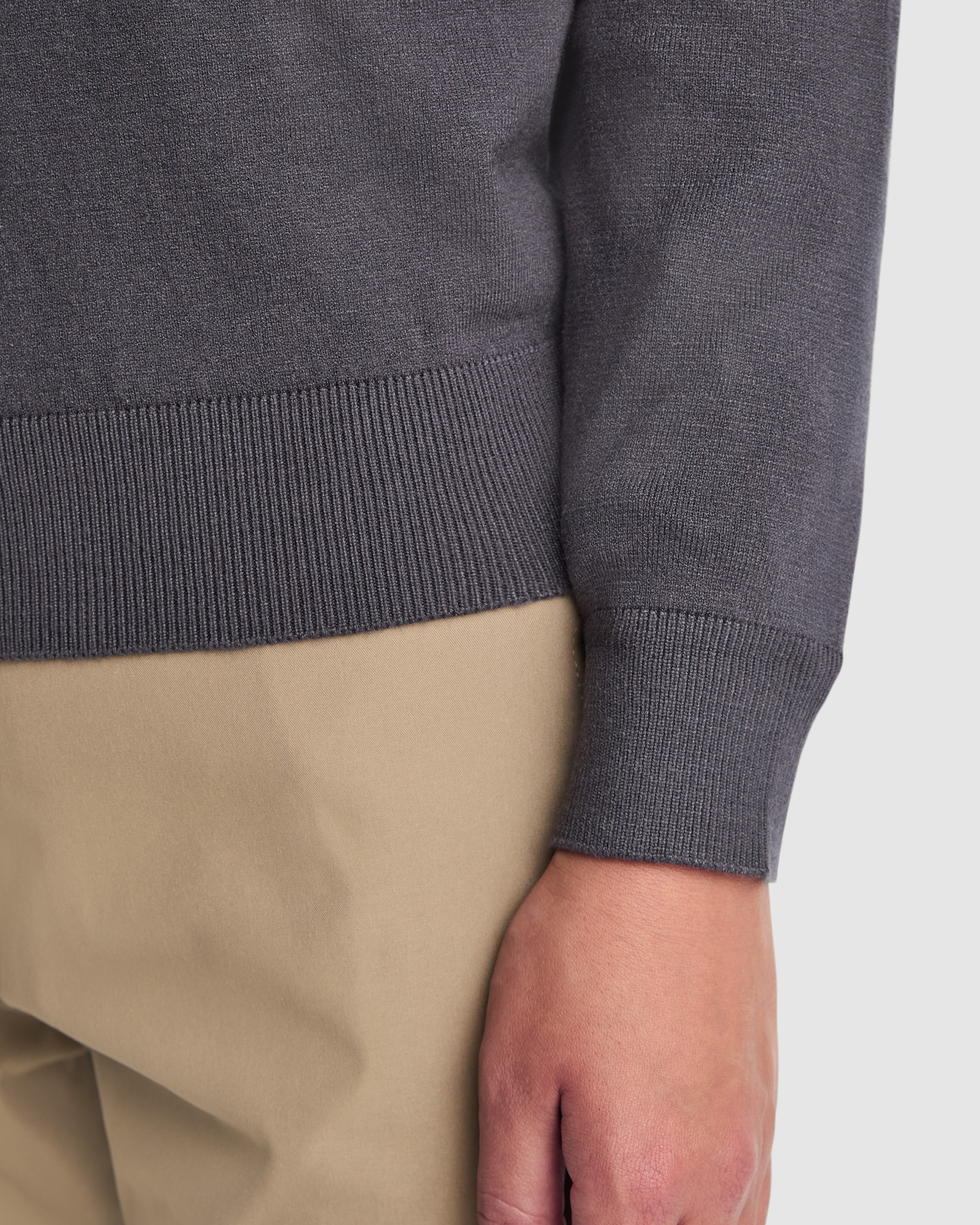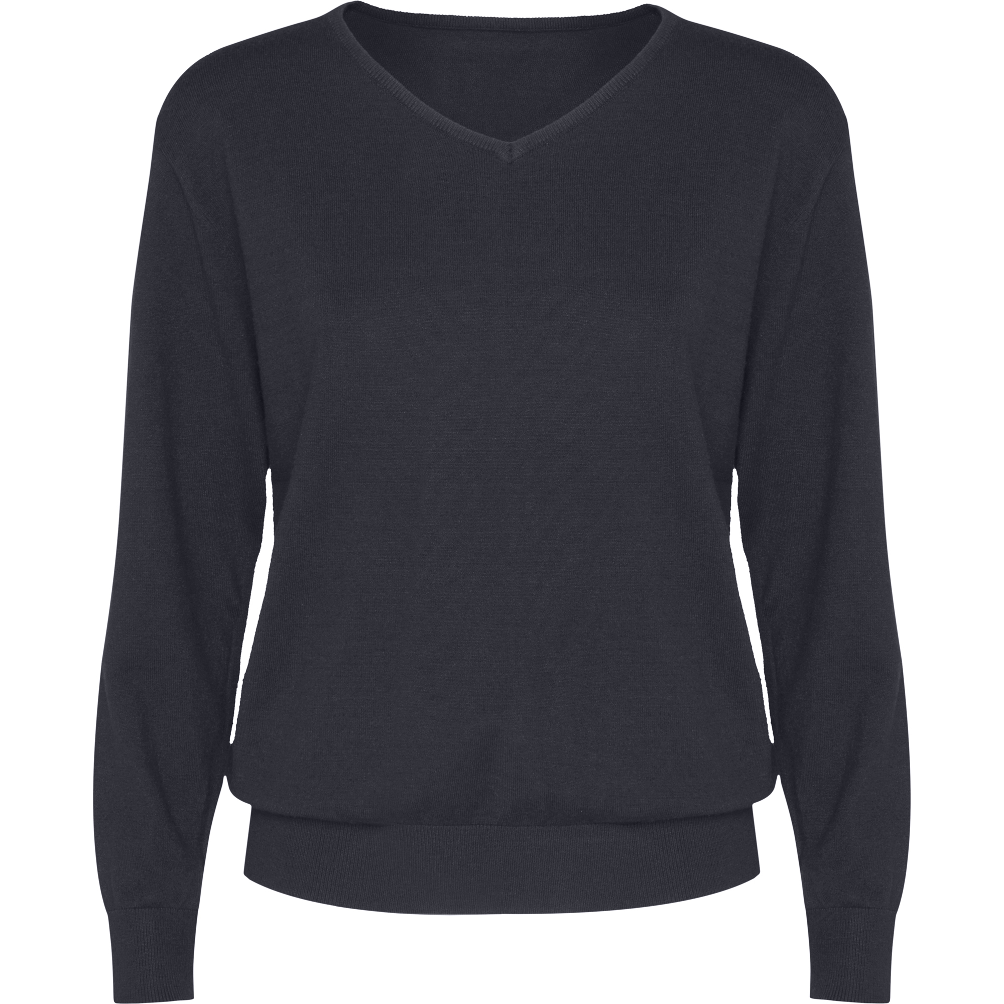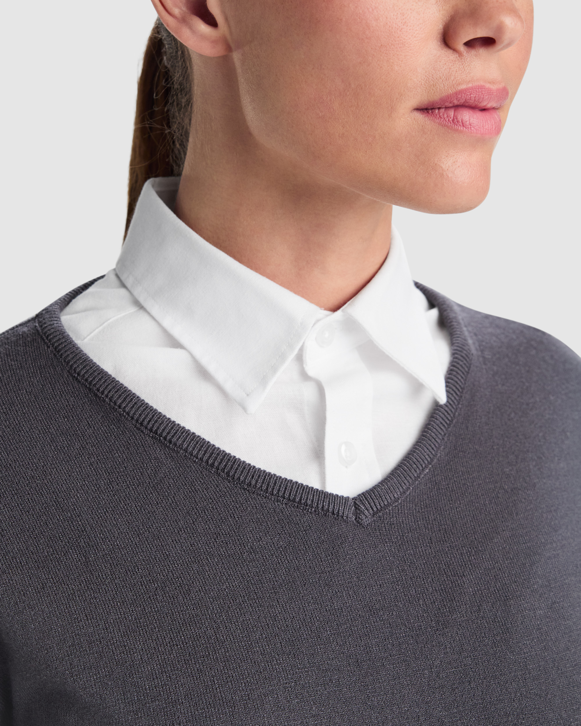 Jersey mujer con escote de pico. · Punto fino. · Puños y bajo en punto canalé 1×1.