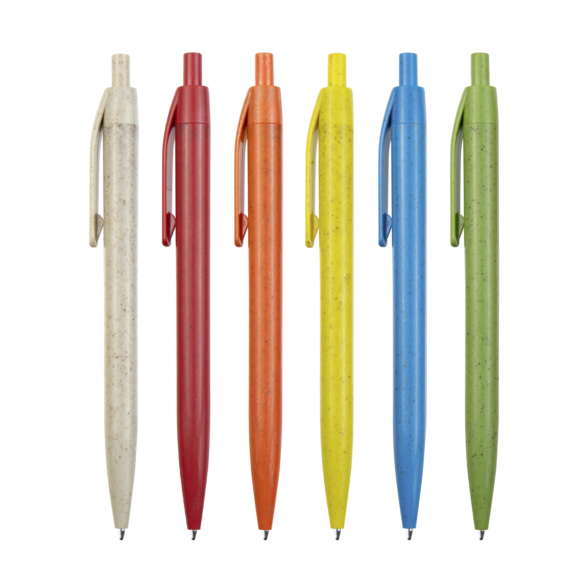 Bolígrafo con pulsador realizado en fibra de trigo y ABS. Tinta azul.