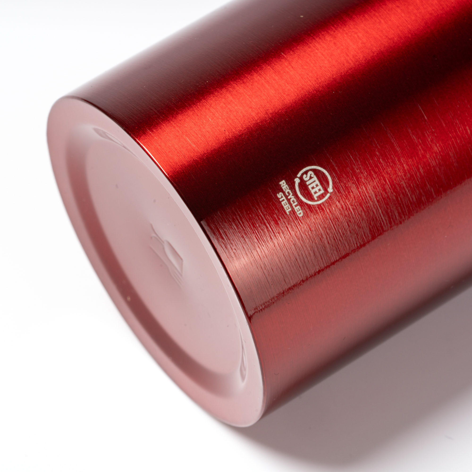 Bidón de acero inoxidable 304 reciclado. Con capacidad para 500 ml. Cuenta con tapón a rosca con silicona para evitar el goteo de las bebidas. Incorpora también un mosquetón en el tapón para hacer más fácil su transporte.