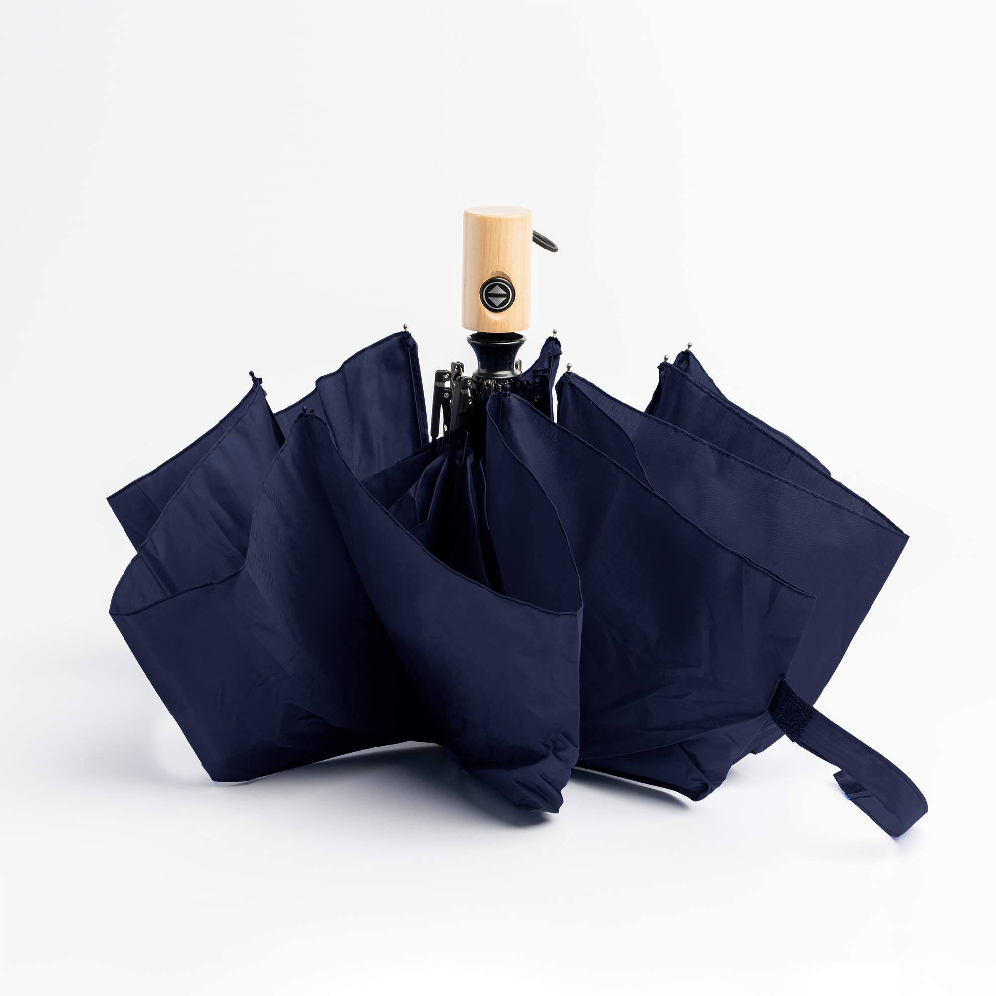 Paraguas de apertura y cierre automáticos con botón incorporado en el mango. Elaborado en tejido pongee 190T con funda a juego. Con varillas de fibra de vidrio y terminaciones en negro con mango de madera. Cierre con velcro a juego. Un paraguas antiventisca idóneo para los días de tormenta. Diámetro 100.