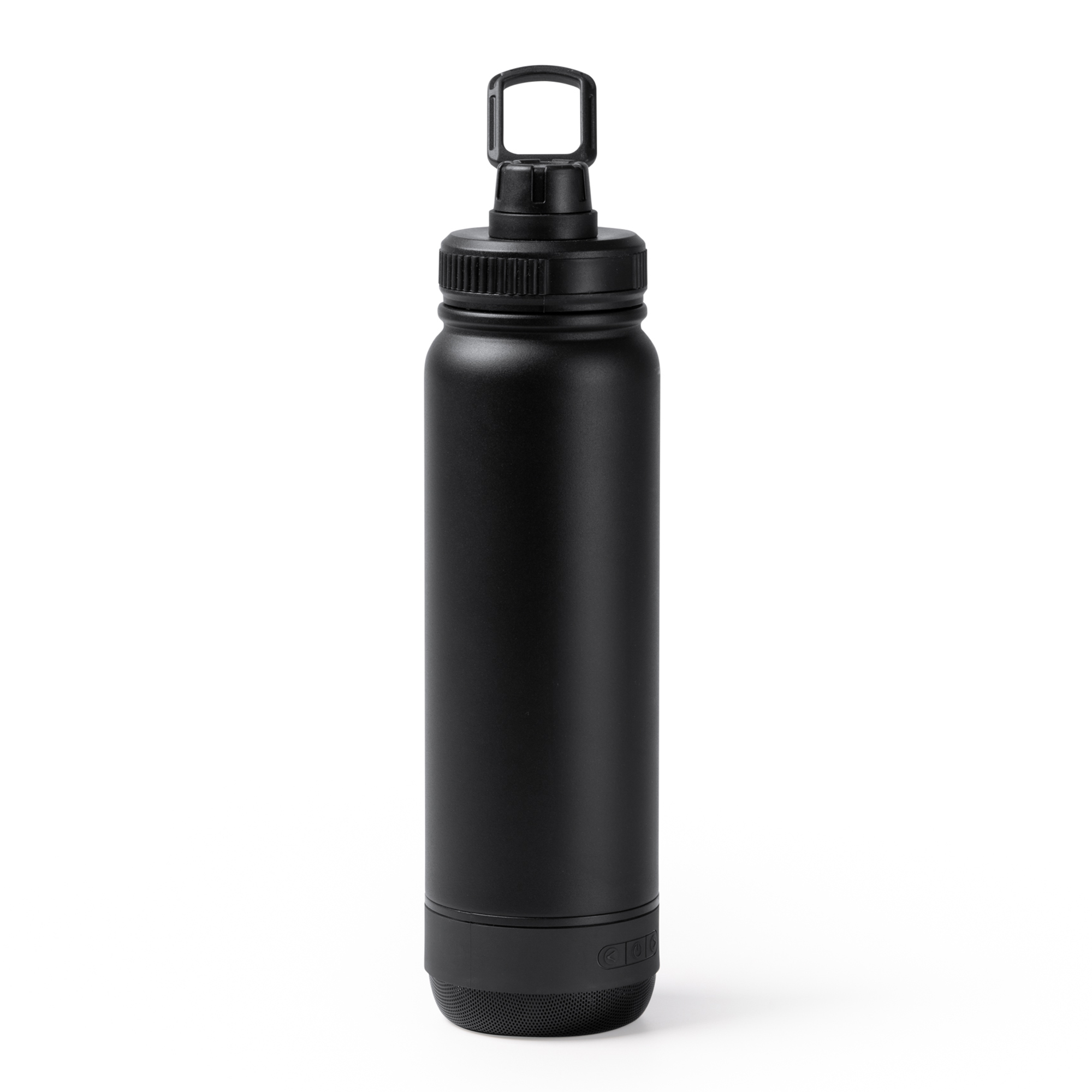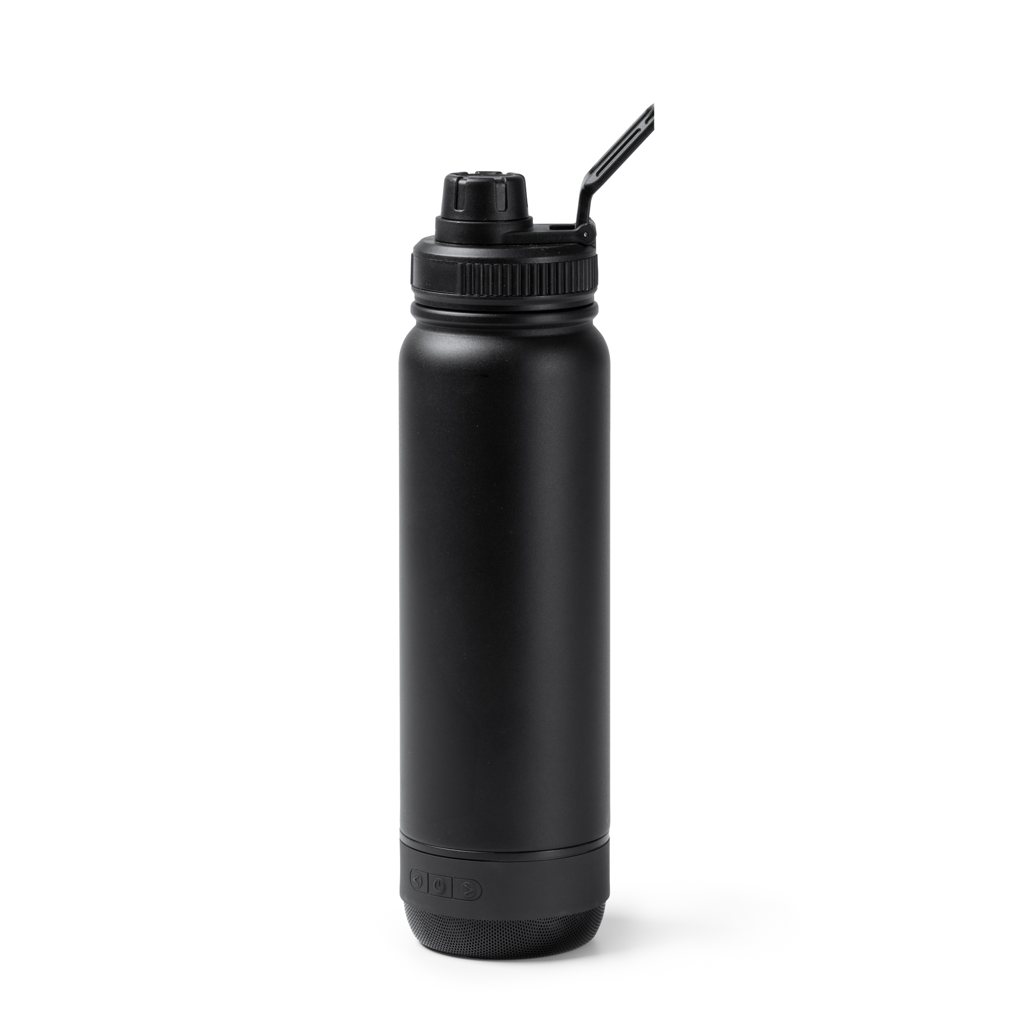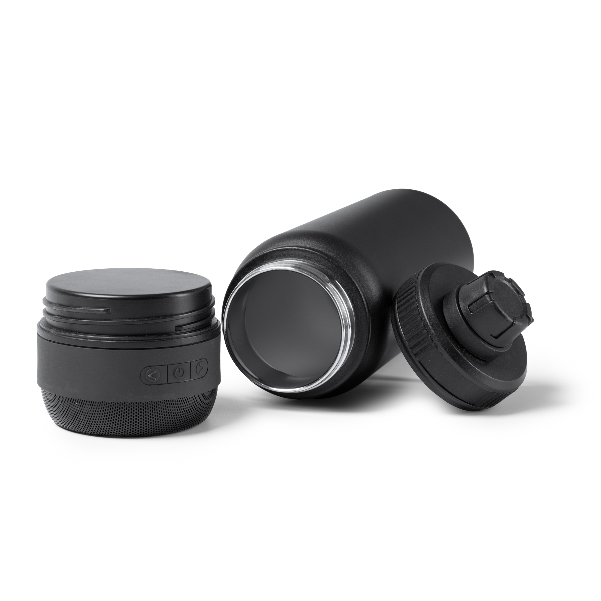 Bidón térmico de acero inoxidable 304 de doble pared con altavoz Bluetooth extraíble en la base. Capacidad del bidón de 650 ml. Tapa con asa de transporte retraíble. Altavoz con 3W de potencia, con batería de litio recargable. Cuenta con botones multifunción de control de reproducción.