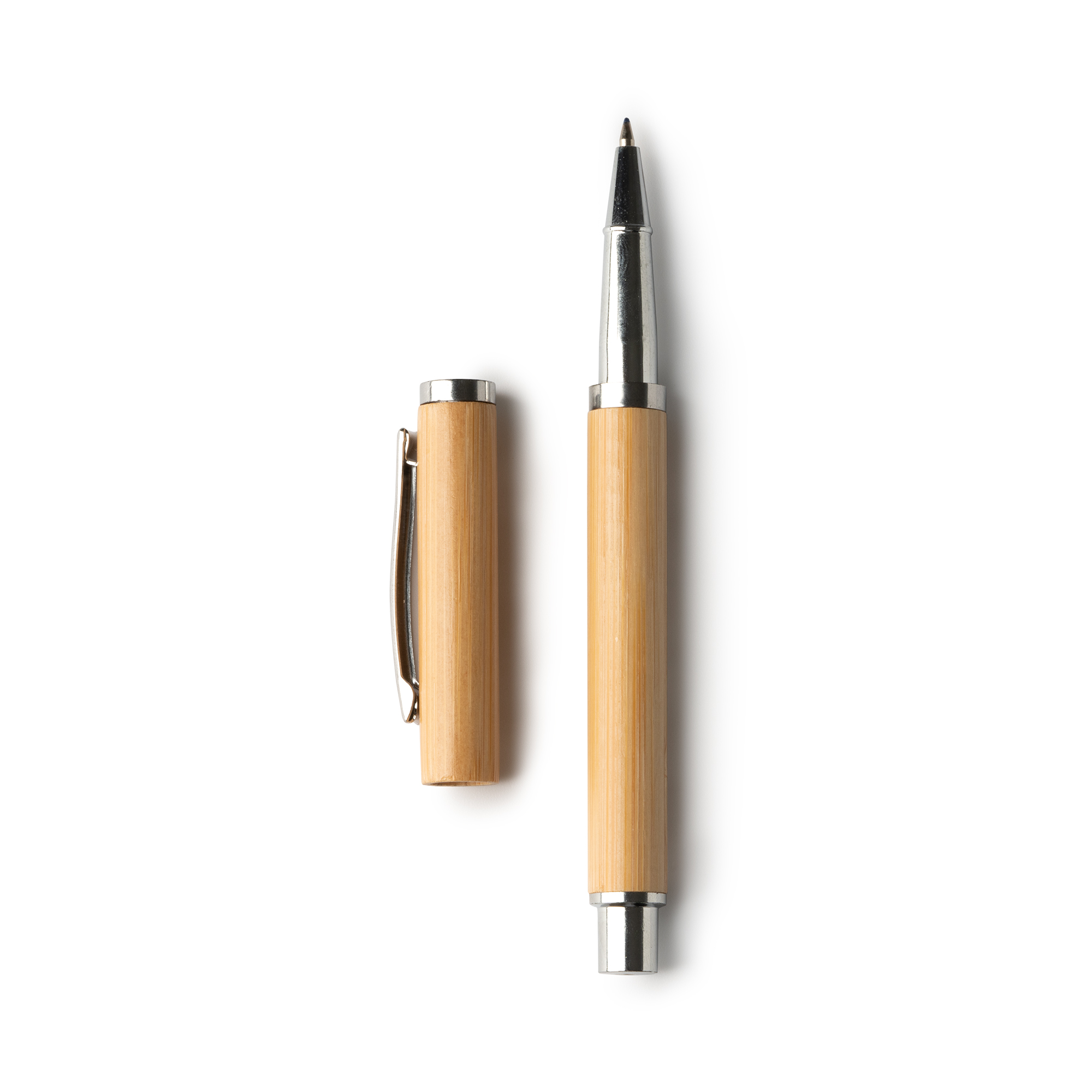 Bolígrafo tipo roller con cuerpo de bambú y detalles metalizados. Carga jumbo de tinta azul.