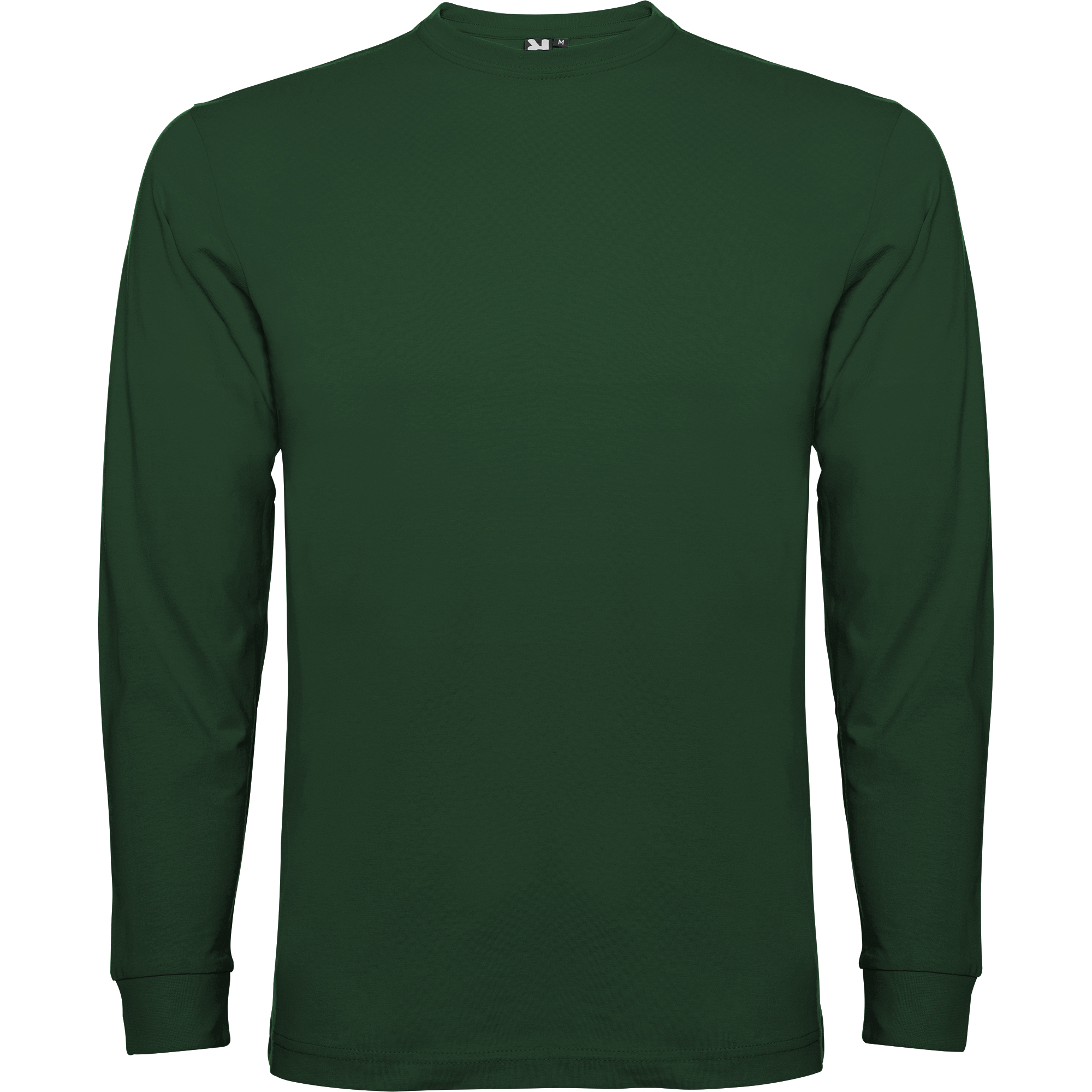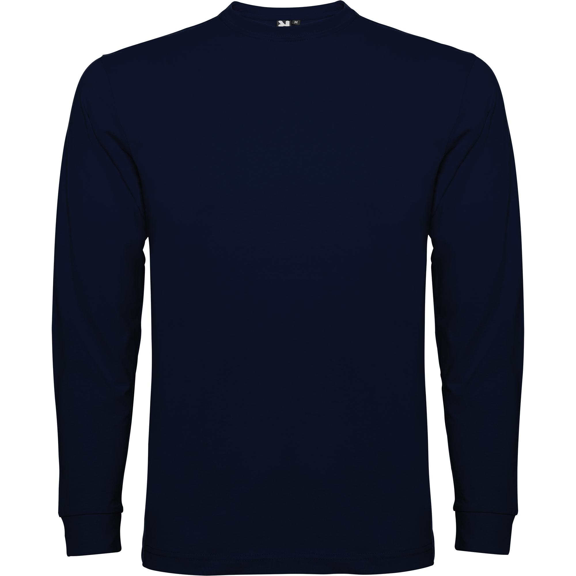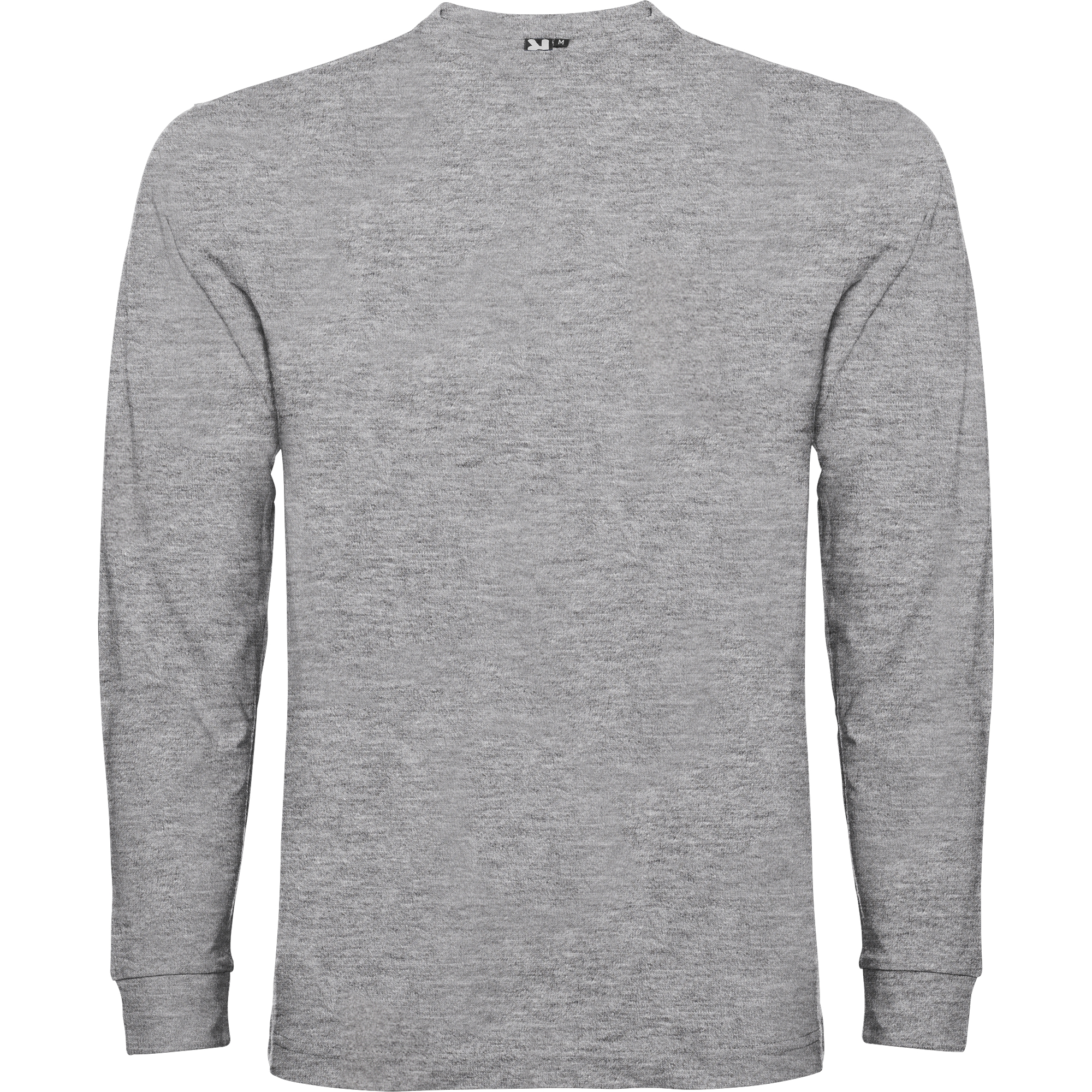 Camiseta de manga larga tubular en tallas de adulto y costuras laterales en tallas de niño. Cuello redondo y puños en canalé 1×1 (cuello 4 capas). Cubrecosturas en cuello del mismo tejido. Composición: 100% algodón, punto liso, 165 g/m². Color gris vigoré 58: 85% algodón / 15% viscosa. Observaciones: *Talla 4XL en los colores: marino 55.