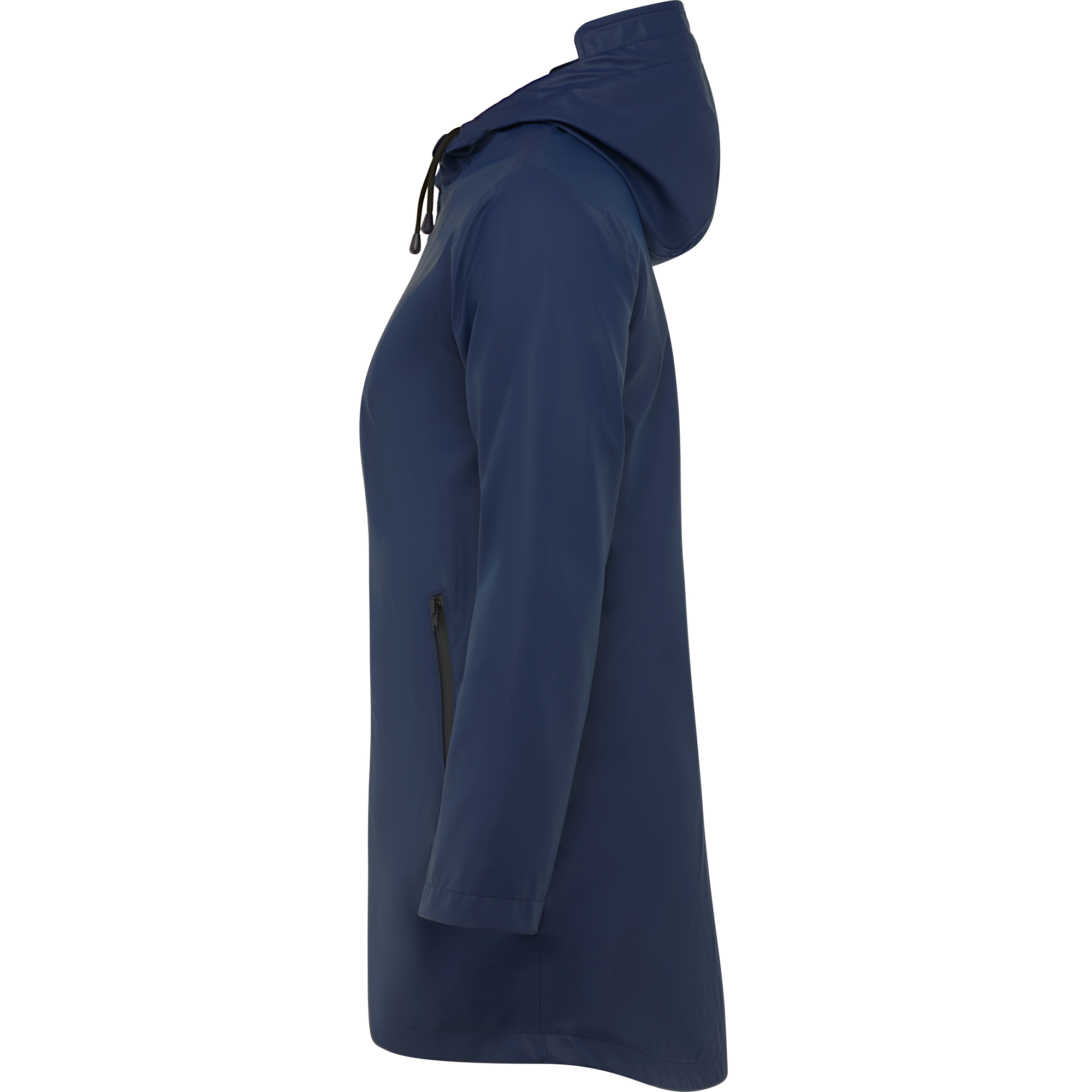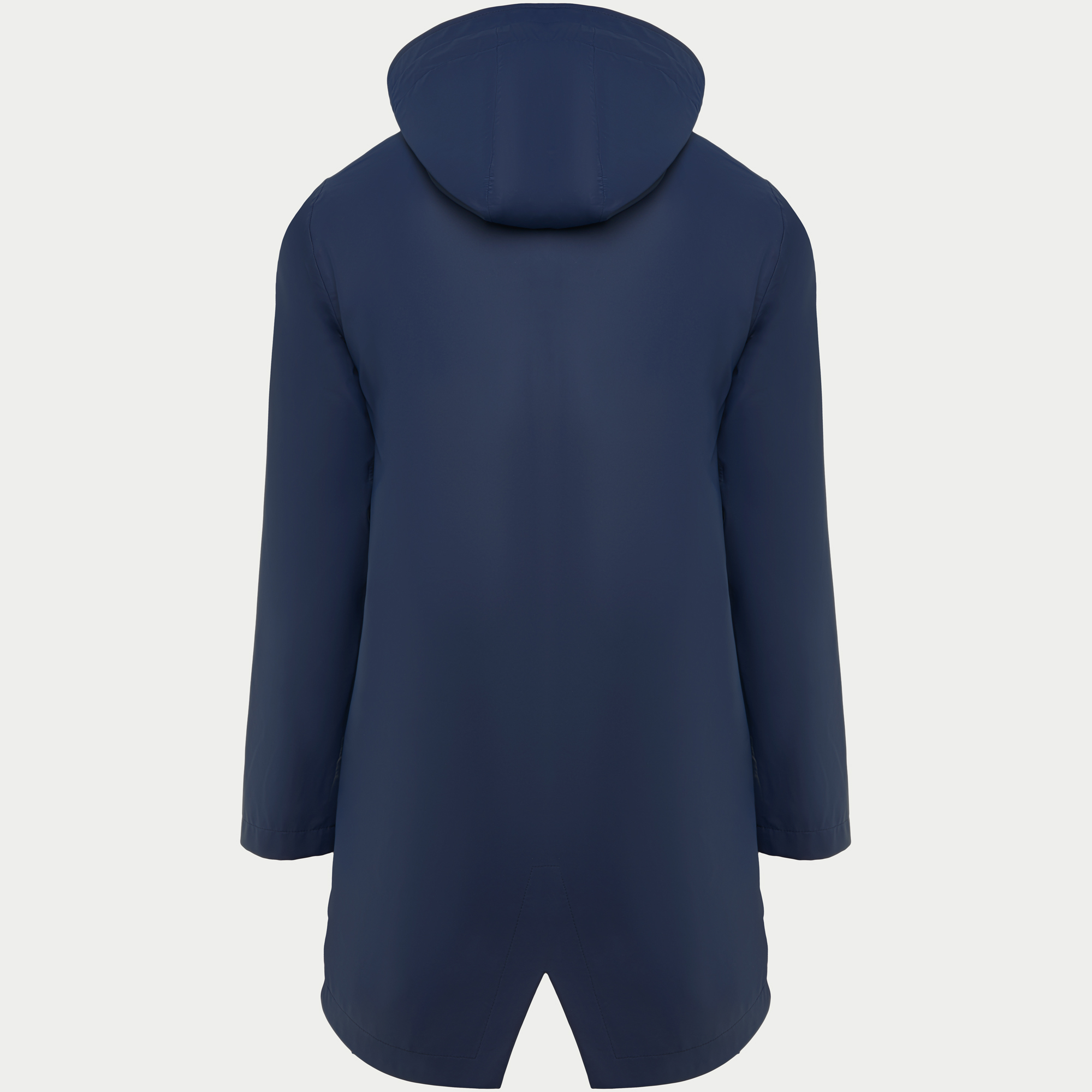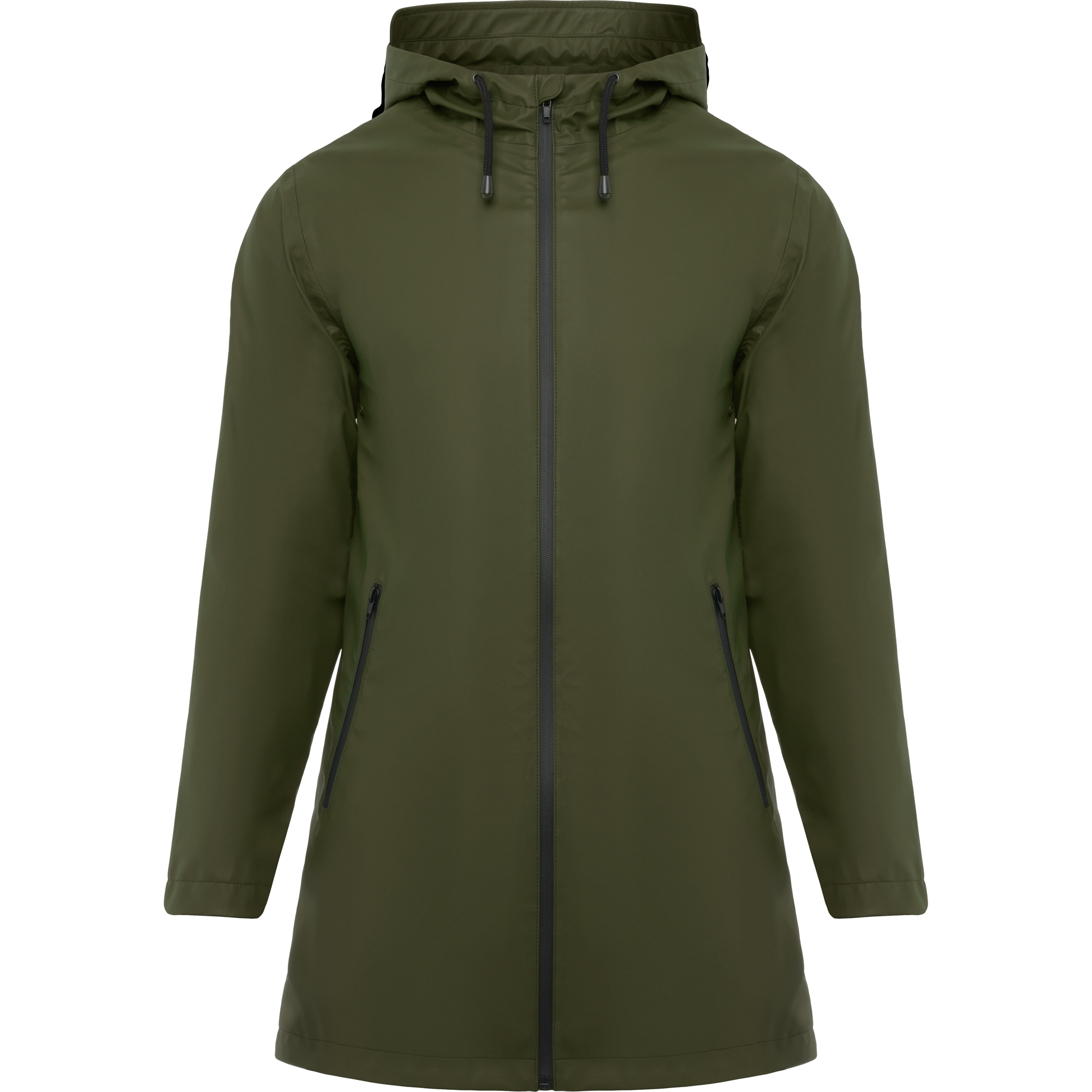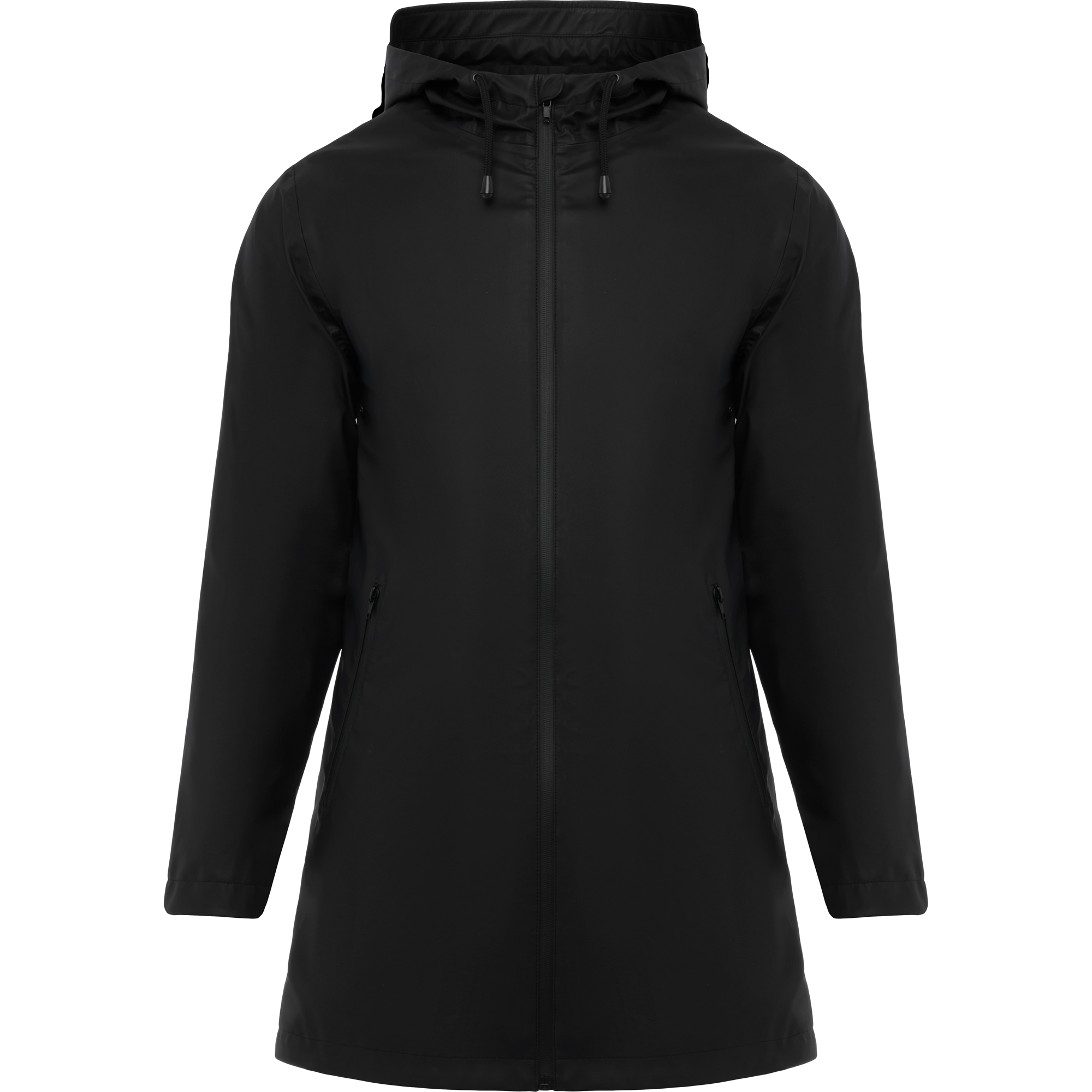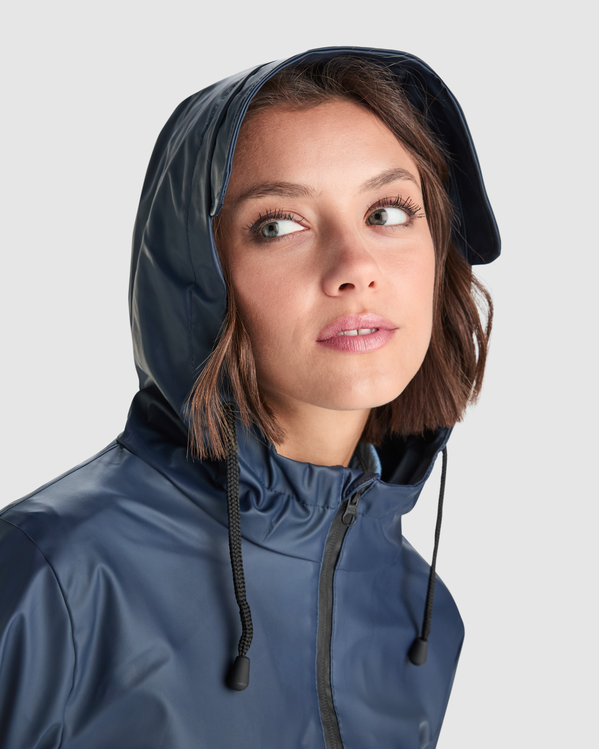 Chubasquero con capucha fija y visera resistente al agua. Ligeramente ajustado en la cintura. Cremallera frontal de doble dirección. Bolsillos laterales y costuras termoselladas. Cordón ajustable en capucha. Apertura trasera. Acceso interior para reprocesos.