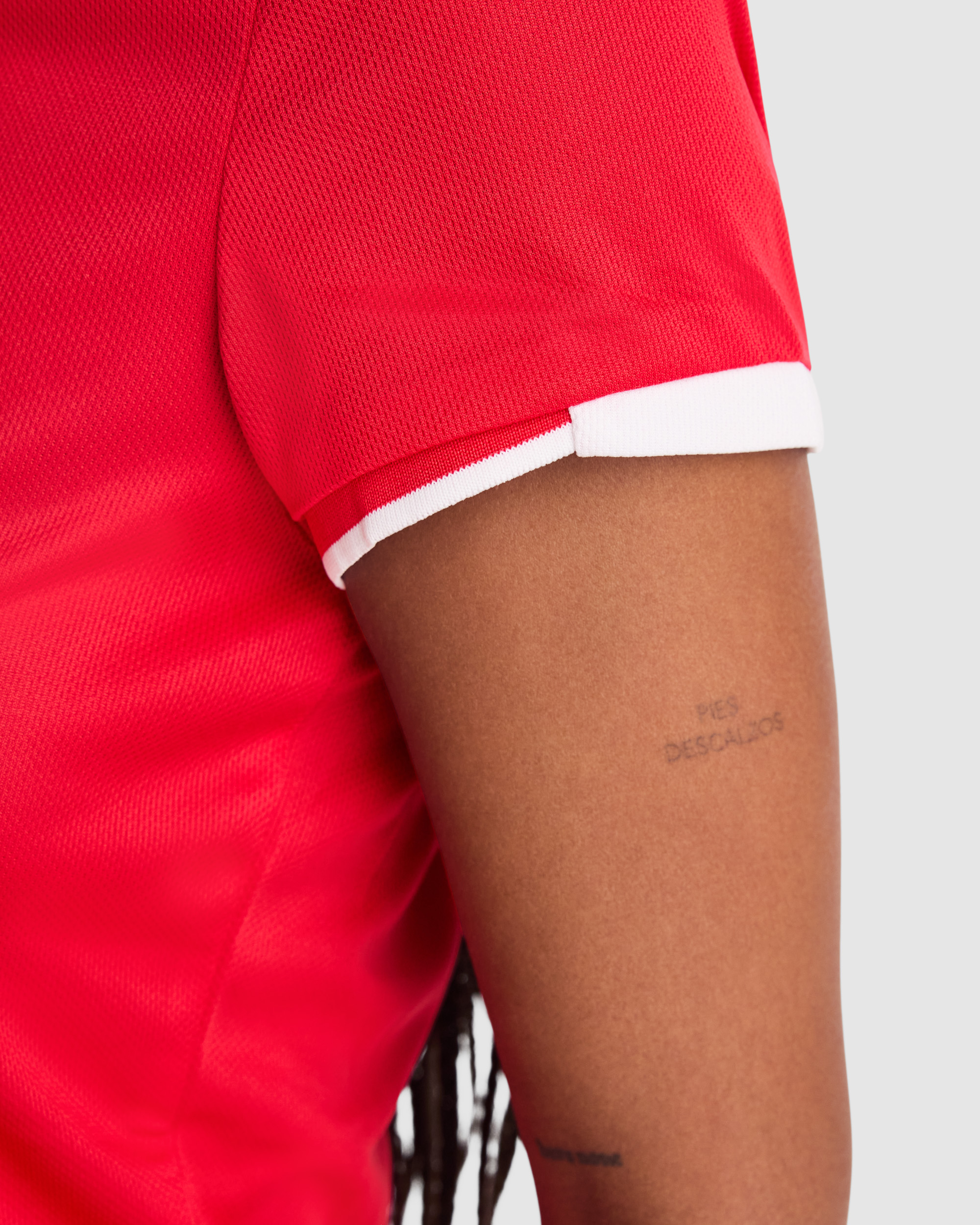 Polo técnico manga corta entallado transpirable. Antibacteriano. Aperturas laterales. Pieza en hombros y bocamanga a contraste. Cuello y puños rib 1×1 al tono con detalle a contraste. Tapeta con botones a presión, uno visible a contraste de color y otro invisible dentro de la tapeta. Cubrecosturas del mismo tejido a contraste. Certificado GRS.