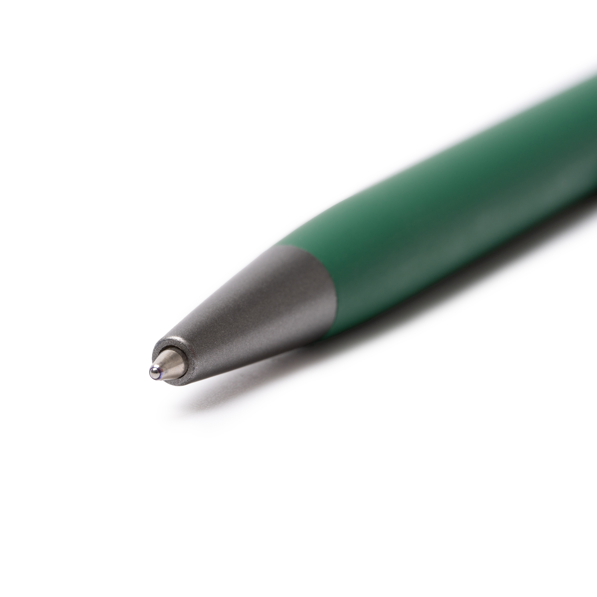 Bolígrafo pulsador con cuerpo de aluminio reciclado y detalles en acabado metálico mate, con cuerpo en textura suave. Tinta azul.
