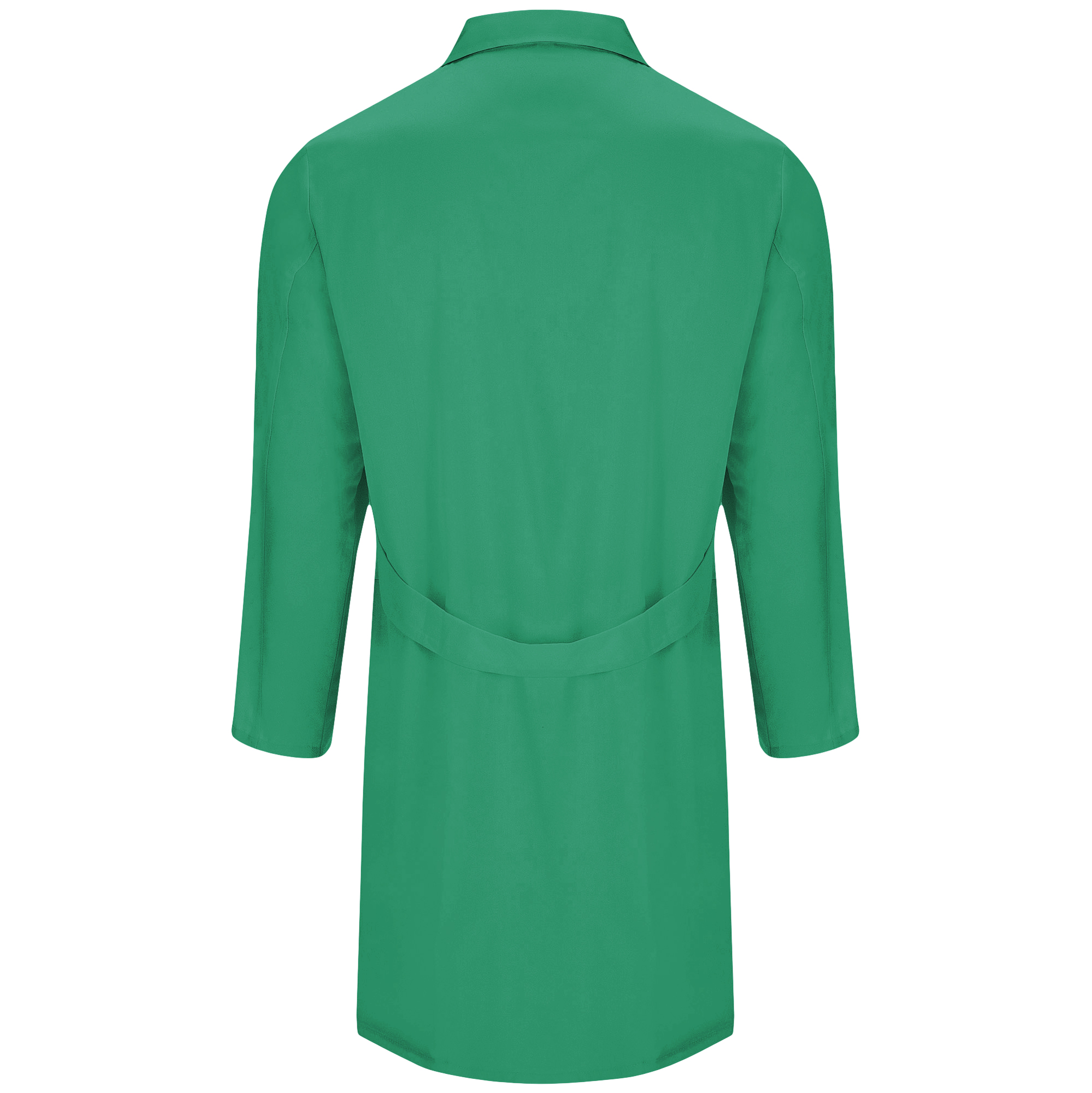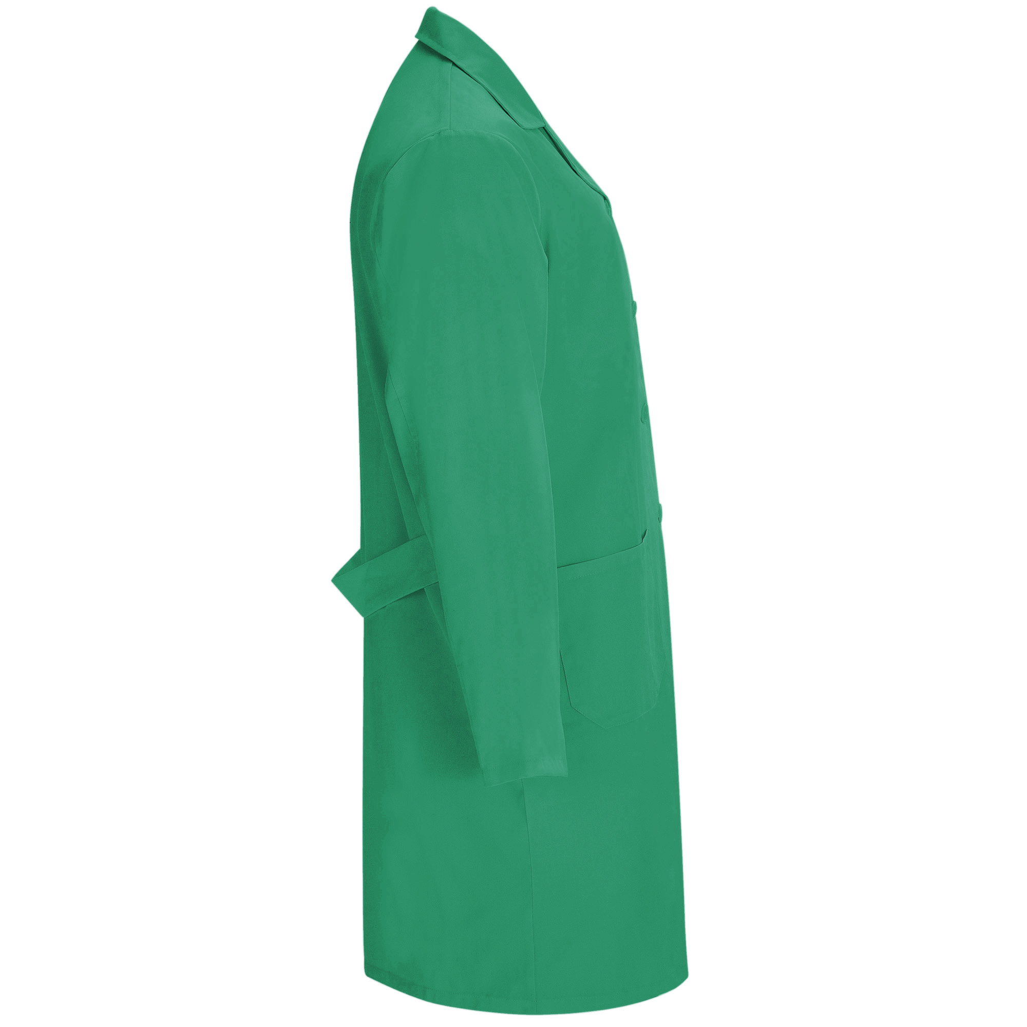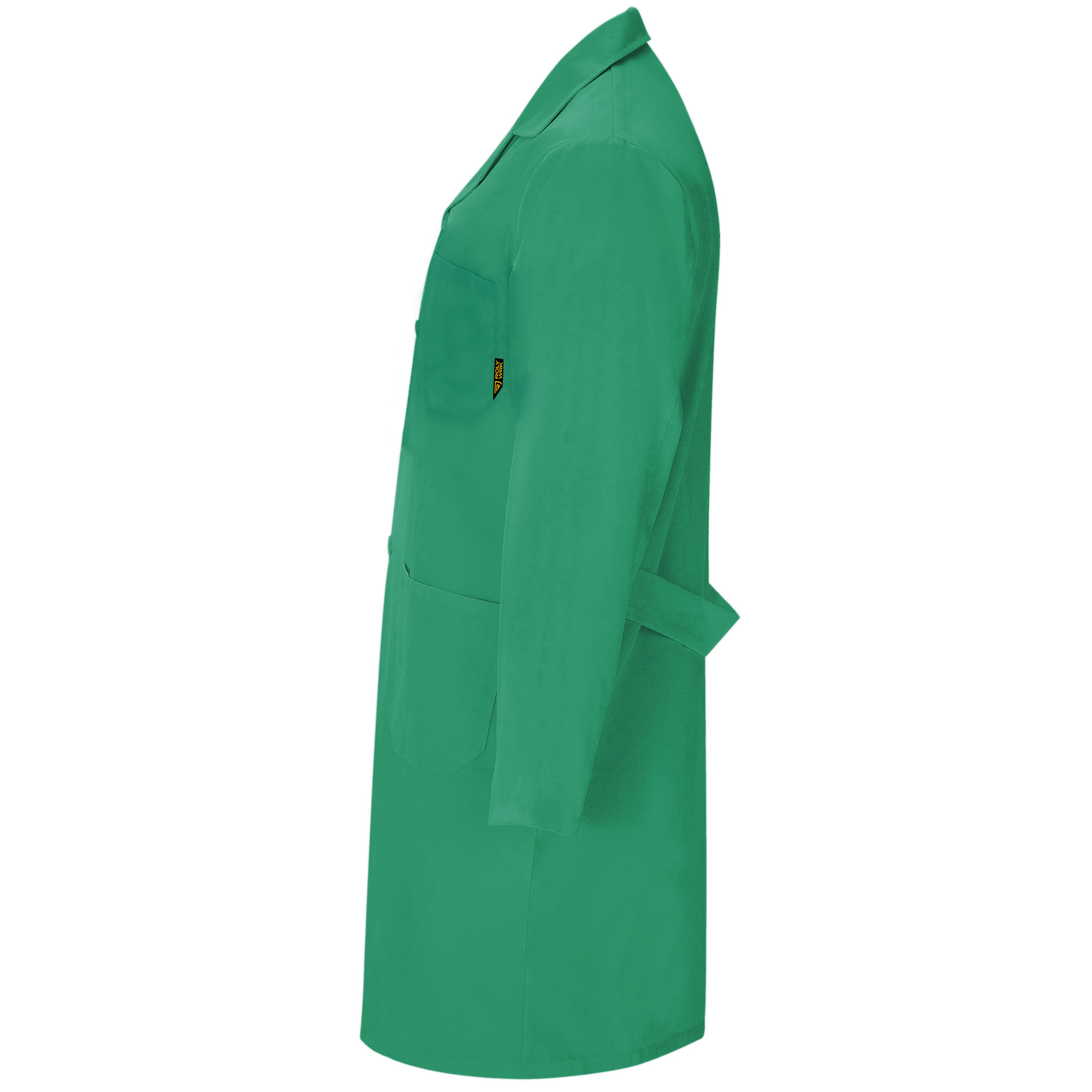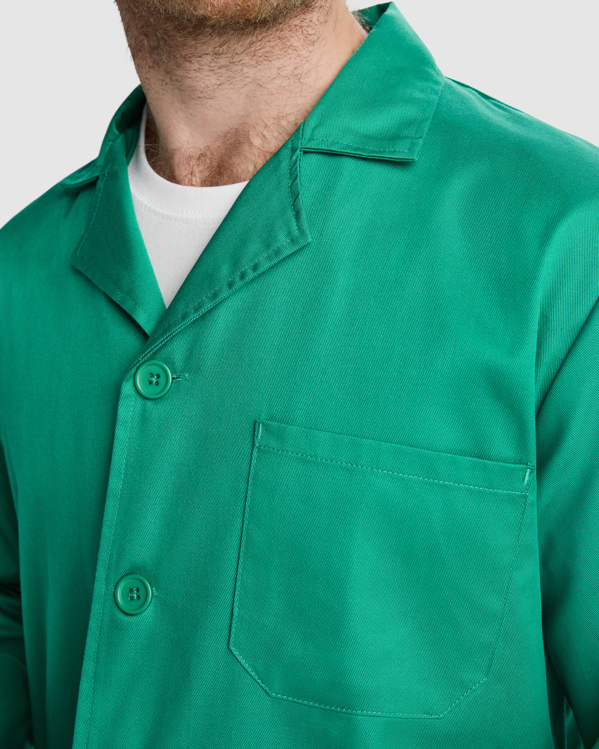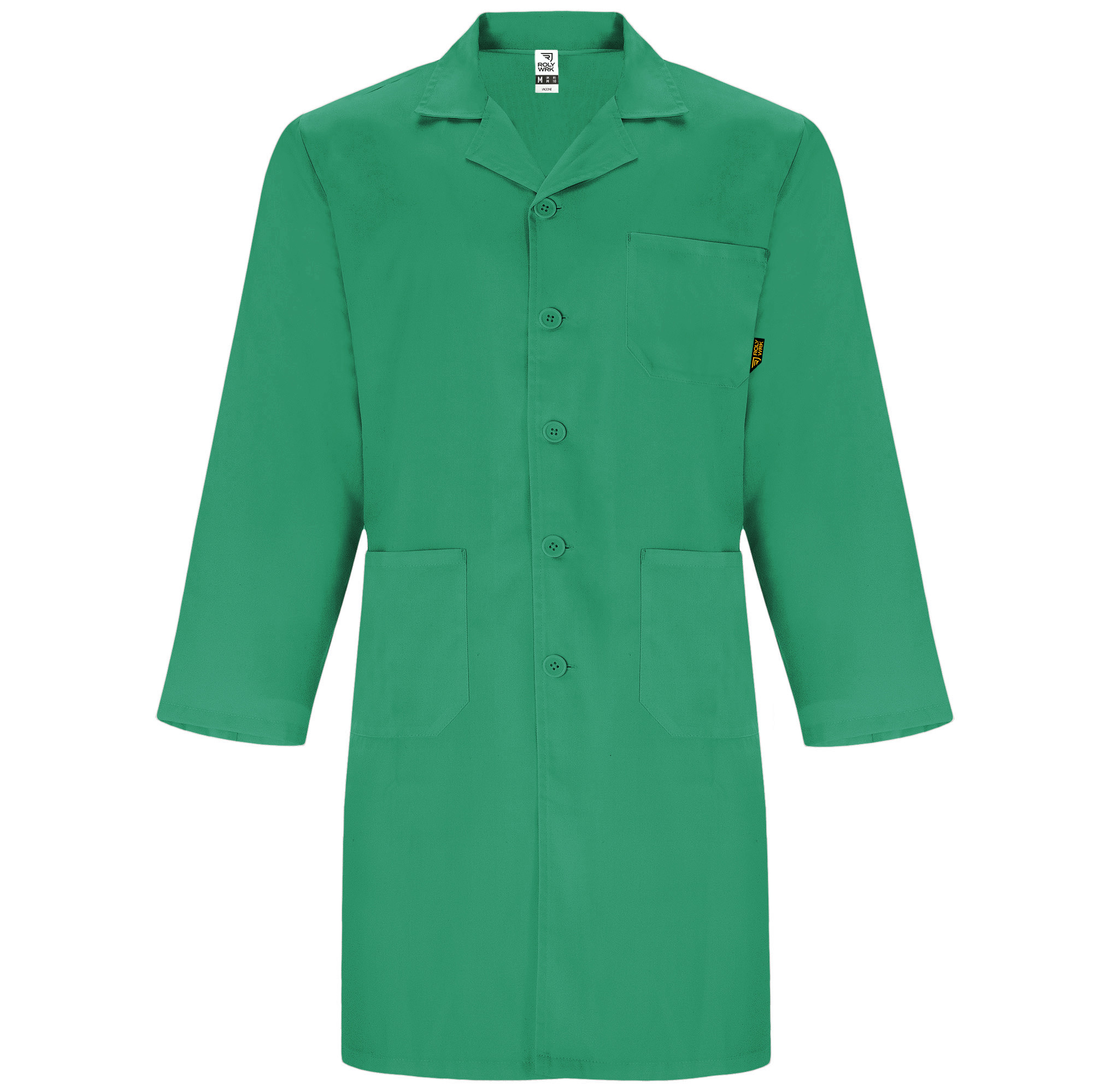 Bata unisex de laboratorio con solapa. · Apertura frontal con botones de plástico al tono. · Dos bolsillos plaqué frontales. · Bolsillo plaqué en pecho izquierdo. · Banda trasera a la altura de la cintura. · Etiquetado Roly WRK exterior.