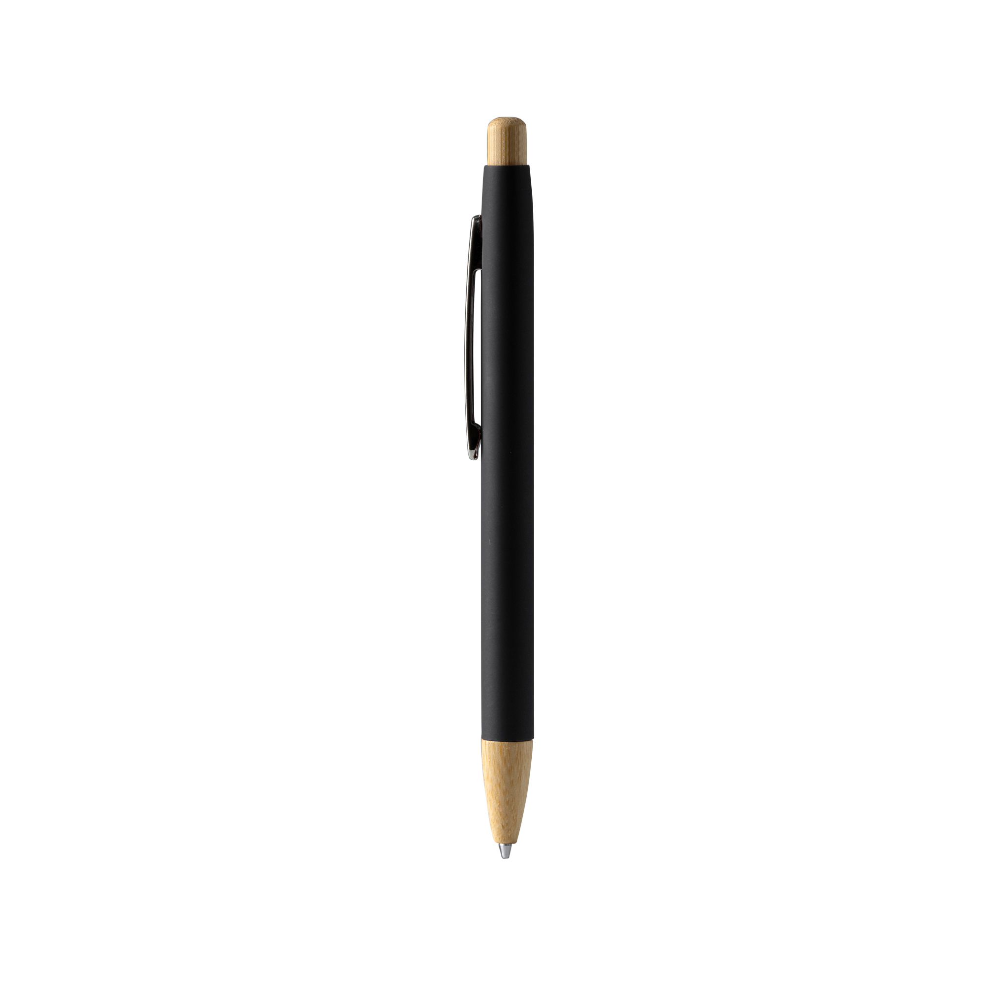 Bolígrafo métalico de acabado goma con pulsador y detalles en bambú, ofreciendo un diseño natural y sostenible. El clip cromado añade un toque de elegancia y funcionalidad. Carga jumbo de tinta azul .