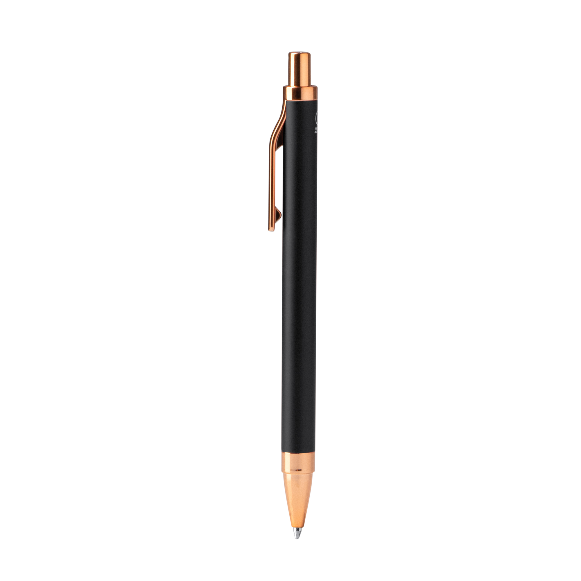 Bolígrafo elaborado en aluminio reciclado de acabado en color liso mate con detalles en color cobre. Cuenta con carga jumbo de tinta azul, ofreciendo una escritura fluida y un uso más prolongado.